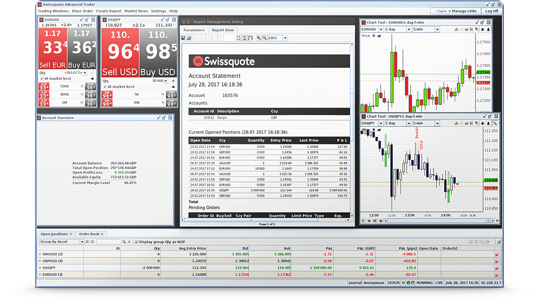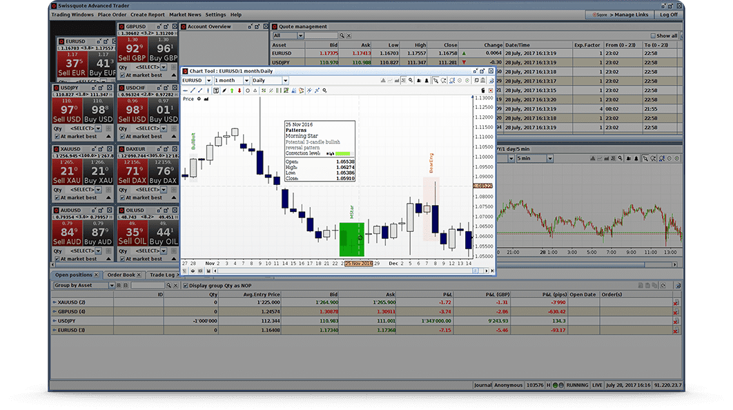 The Swissquote Advanced Trader platform contains all the features you need to become a successful trader. It includes 27 indicators, 17 overlays, and news from Swissquote and Bloomberg directly in the interface.
