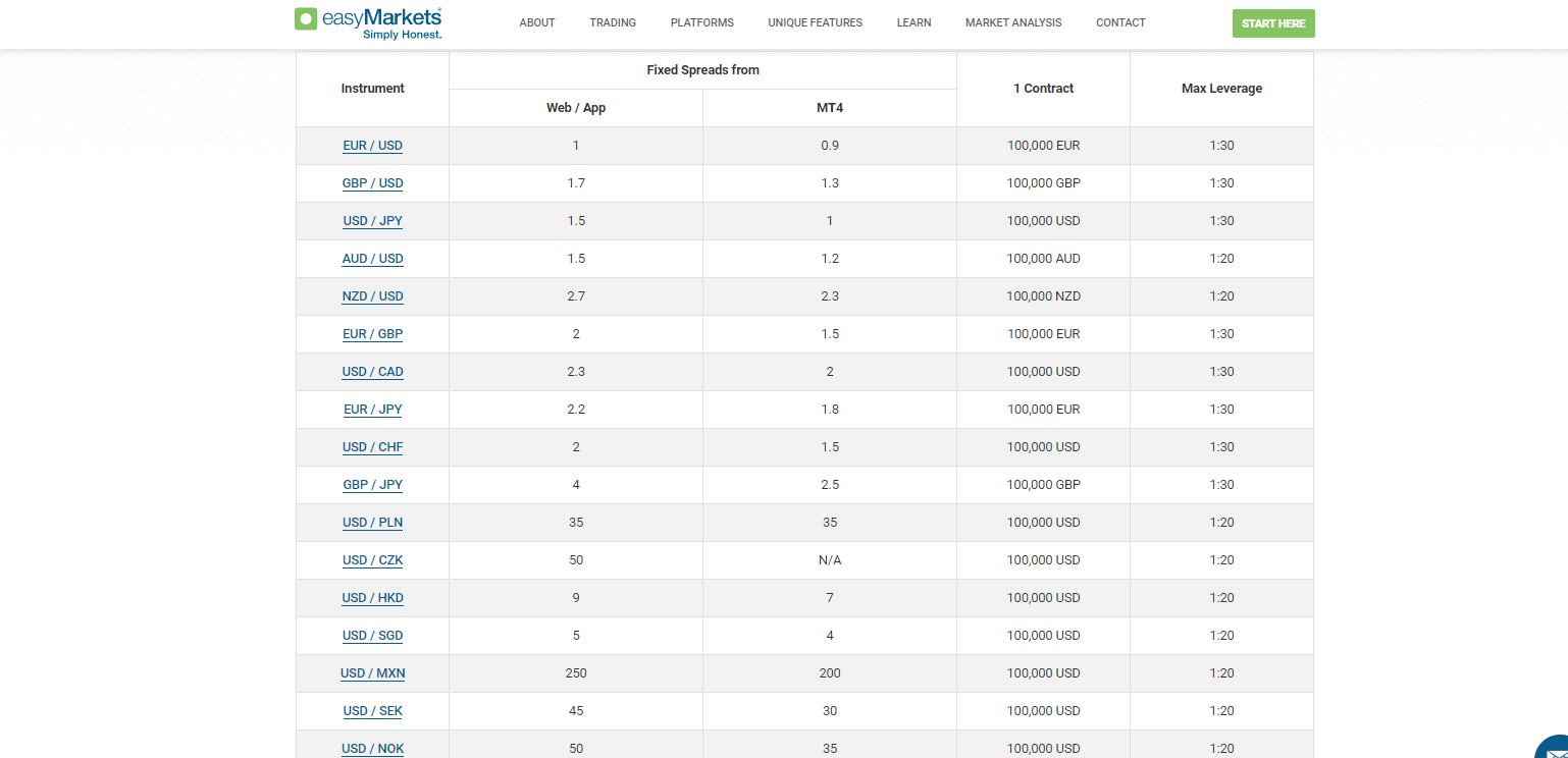 The fixed spreads at easyMarkets are on the high side, creating a pricing environment that is less than ideal. At 0.9 pips, the EUR/USD spread is the lowest and is fairly competitive (if not slightly high) with other market makers, but other assets carry a more significant mark-up. Spreads in the MT4 trading platform are lower than in its proprietary webtrader. Variable spreads at FXCM start as low as 0.6 pips commission-free. For a commission of $25 per $1,000,000, trading costs are reduced to 0.2 pips. FXCM offers traders a far superior pricing structure as compared to easyMarkets.