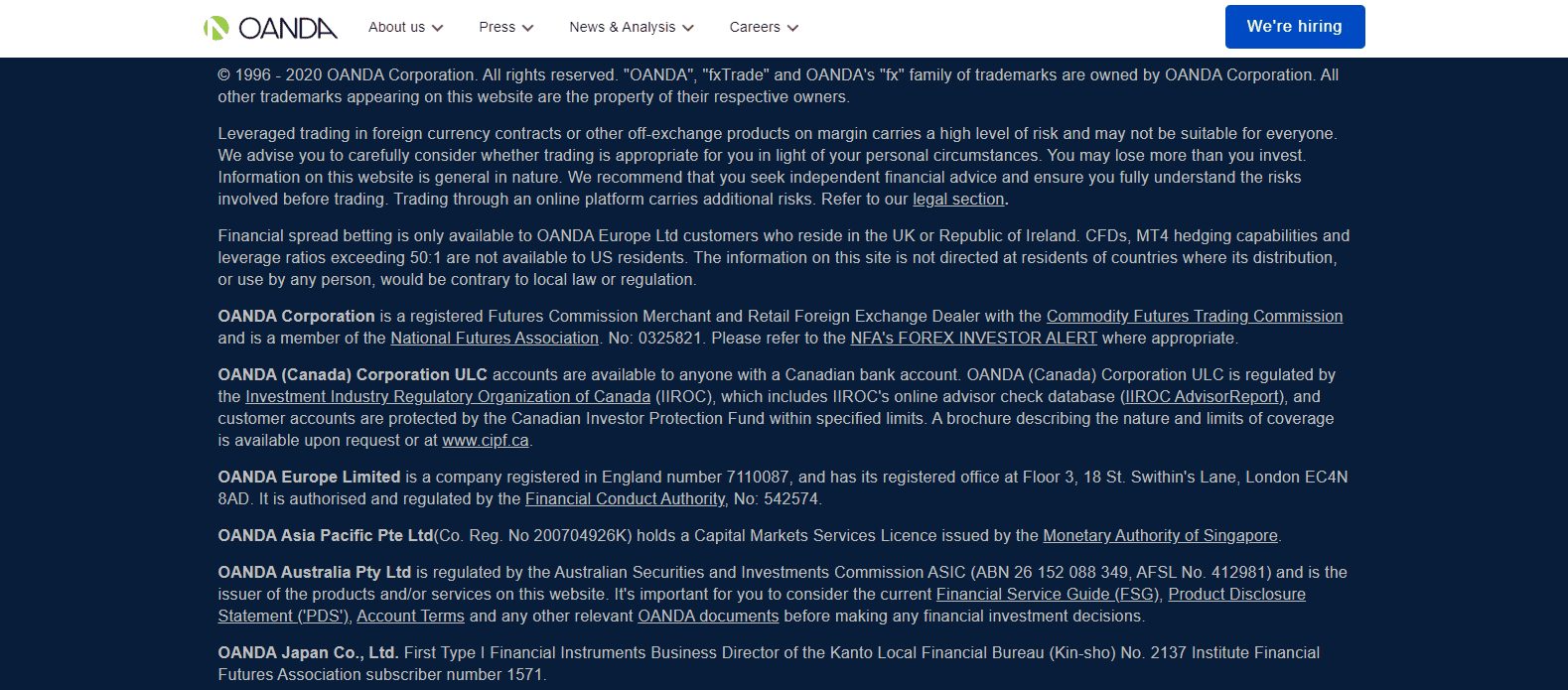 The primary regulator of Oanda is the US Commodity Futures Trading Commission (CFTC) and the National Futures Association (NFA). Adding a global framework is the FCA in the UK, the IIROC in Canada, the MAS in Singapore, the ASIC in Australia, and the FSA in Japan.