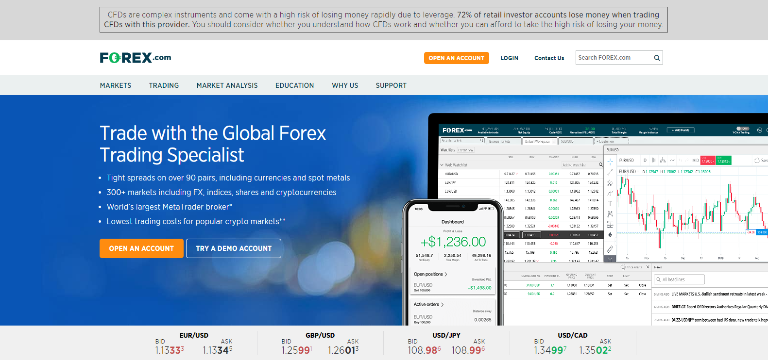 As of April 2019, and based on active servers per broker, Forex.com claims to be the largest MT4 broker. It provides an upgraded trading experience with third-party plugins from Reuters for live news, Autochartist Trade Ideas for automated pattern recognition, and technical analysis from Trading Central. The proprietary Advanced Trading Platform offers a genuine alternative to the MT4, equipped with over 100 predefined indicators. Both platforms support automated trading solutions, and a webtrader completes an excellent choice of trading platforms.