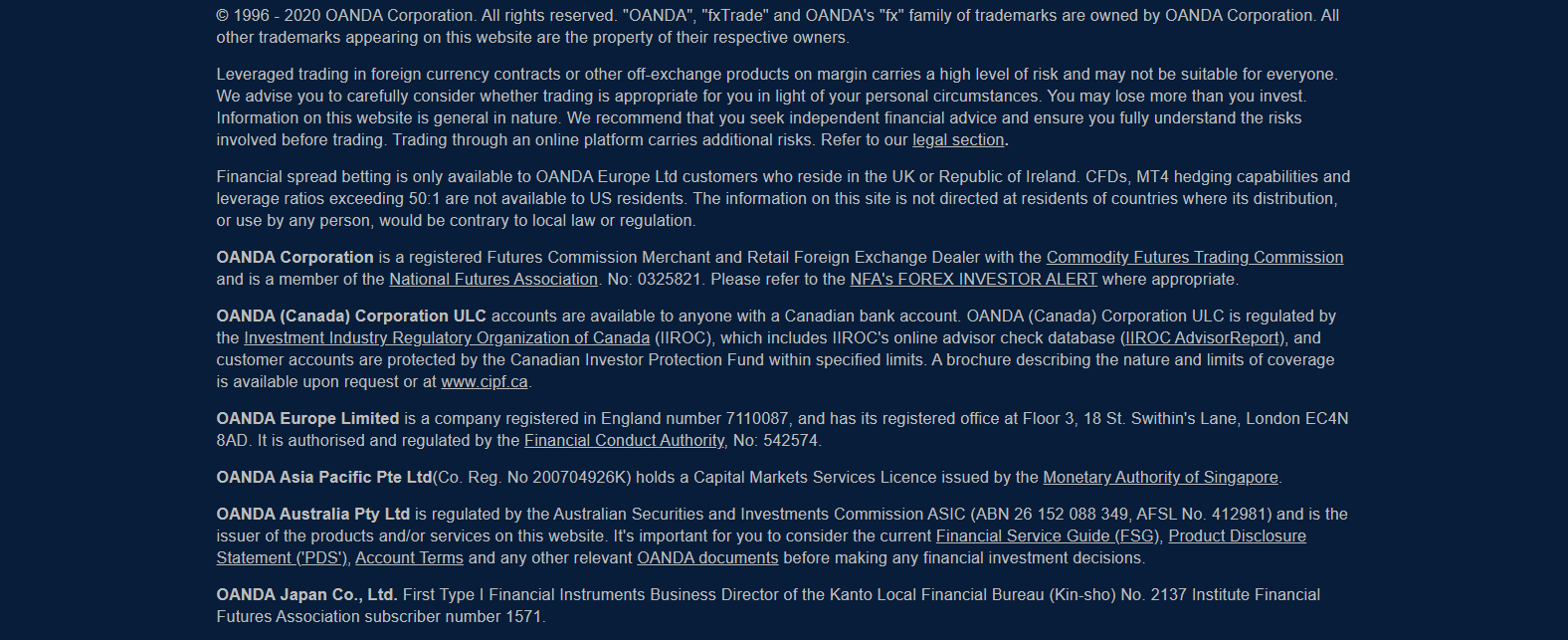 Oanda’s principal regulator is the US Commodity Futures Trading Commission (CFTC) and NFA. Completing regulatory oversight are the FCA in the UK, the IIROC in Canada, the MAS in Singapore, the ASIC in Australia, and the FSA in Japan. This broker has a clean supervisory record, and traders may fully trust Oanda with personal information and deposits. From a regulatory perspective, Forex.com and Oanda each provide an exemplary approach.