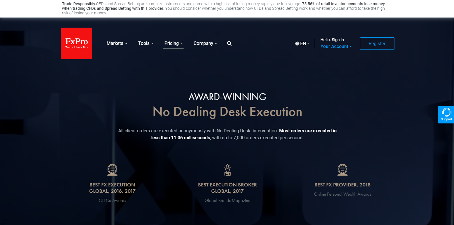 New traders have access to an excellent educational platform, with an entire section dedicated to trading psychology. The well-designed educational course features video tutorials and trading tests, creating an outstanding service. FxPro grants its traders a comprehensive analytical suite through a partnership with Trading Central but also publishes in-house market news. The combination of services continually reduces the failure rate of traders, which is currently reported at 75.56%.