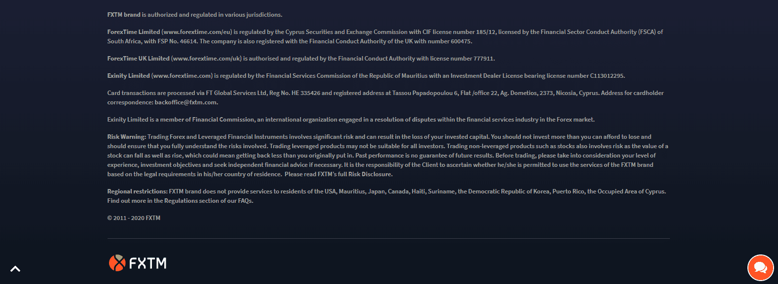 Exinity Limited, the owner of FXTM and Alpari, maintains primary regulation with the Financial Services Commission (FSC) of the Republic of Mauritius. It is also a member of the Hong Kong-based Financial Commission, where protection of up to €20,000 per trader exists. The Cyprus Securities and Exchange Commission (CySEC) and the Financial Conduct Authority (FCA) regulate ForexTime Limited and ForexTime UK Limited, respectively. Client deposit protection up to €20,000 and £85,000 under the Cypriot Investor Compensation Fund (CIF) and the Financial Services Compensation Scheme (FSCS), respectively, grant additional security. PricewaterhouseCoopers Limited (PwC), a Big Four accounting firm, audits FXCM per the International Standard on Assurance Engagements (ISAE) 3000.