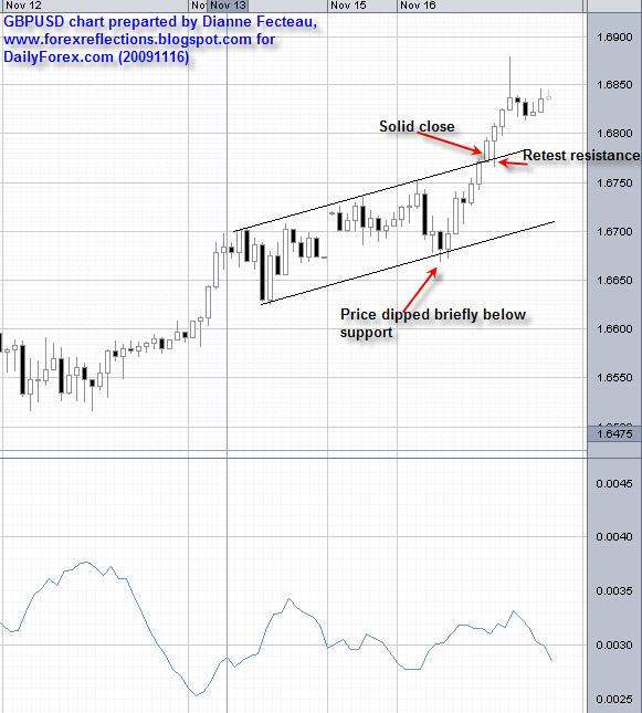 There is another type of breakout: a breakout beyond a trend line forming the boundary of a Forex candlestick pattern. For an example, in the price chart below, the EUR/USD traded within a symmetrical rising price channel for twelve consecutive days, before making a bearish (downwards) breakout, which is also known as a breakdown, on the thirteenth day. The day of the breakdown is marked by the downwards arrow in the chart.