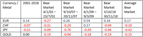 In addition to the Japanese Yen, I also included two other assets typically seen as safe-havens: the Swiss Franc, and Gold. The Swiss Franc has a very slight negative correlation overall with the S&P 500 Index of -0.07, which gets just a little stronger during bear markets. This suggests that the Swiss Franc is maybe not as much of a safe-haven as its often thought to be yet is still has a (small) negative correlation with stocks. Turning to Gold, the case gets stronger: overall, it is perfectly uncorrelated with the S&P 500 Index, but in each of the four bear markets analyzed, there was a significantly stronger negative correlation. Finally, I threw in the Euro just for variety, and it seems to go up when stocks go up, and down when stocks go down, so it doesn’t look like much of a safe-haven over the full period.