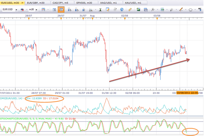 A general uptrend is seen; analyzing what DMI says, we can’t see a trend. However, stochastics show that the pair is oversold, which means that it will go up.