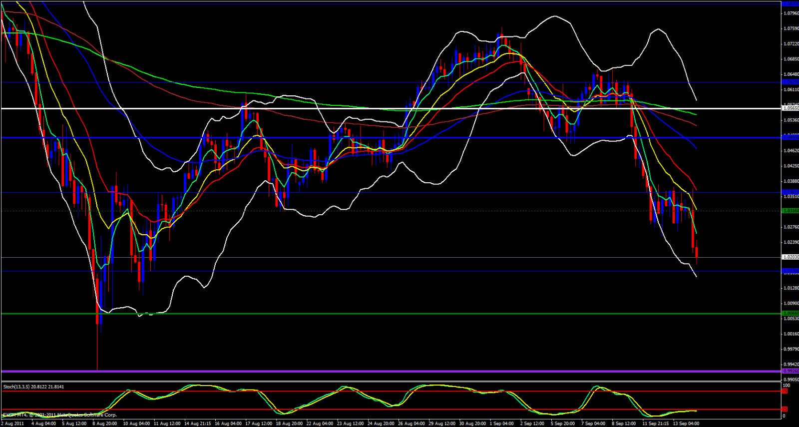 On the Daily chart 55 rms has dived straight through the 233 ema and the lower Bollinger Band is wide open. It doesn't look like there is much in the way before 1.0140 area so I would probably try to hold out for a 38.2 Fib Retracement which will over lap with the15 Minute 21 ema which also overlaps yesterdays low. 1.0260 area would be a great place to enter a short if price could retrace that far then you could just set a stop at 1.0290 hope price will fall to 1.0120 area which is the weekly S3.