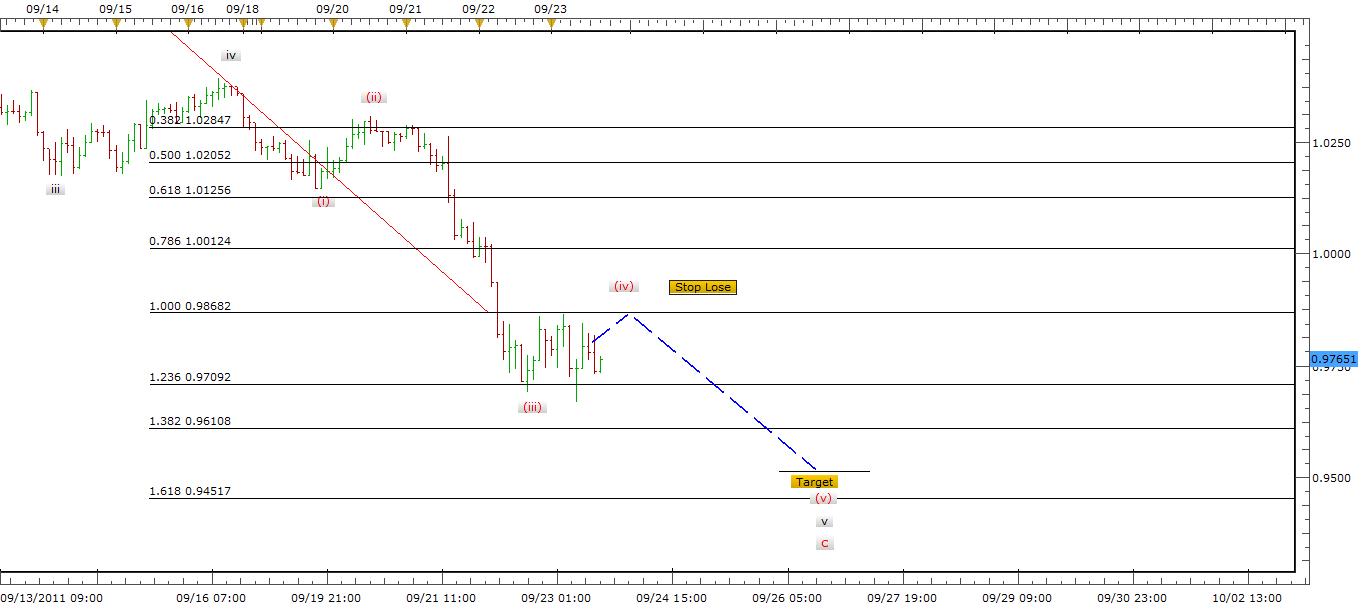Description: We are in wave (iv) in v in C wave. Trend still have room to fall further targeting 1.618 Fib level or 0.9500 price point.