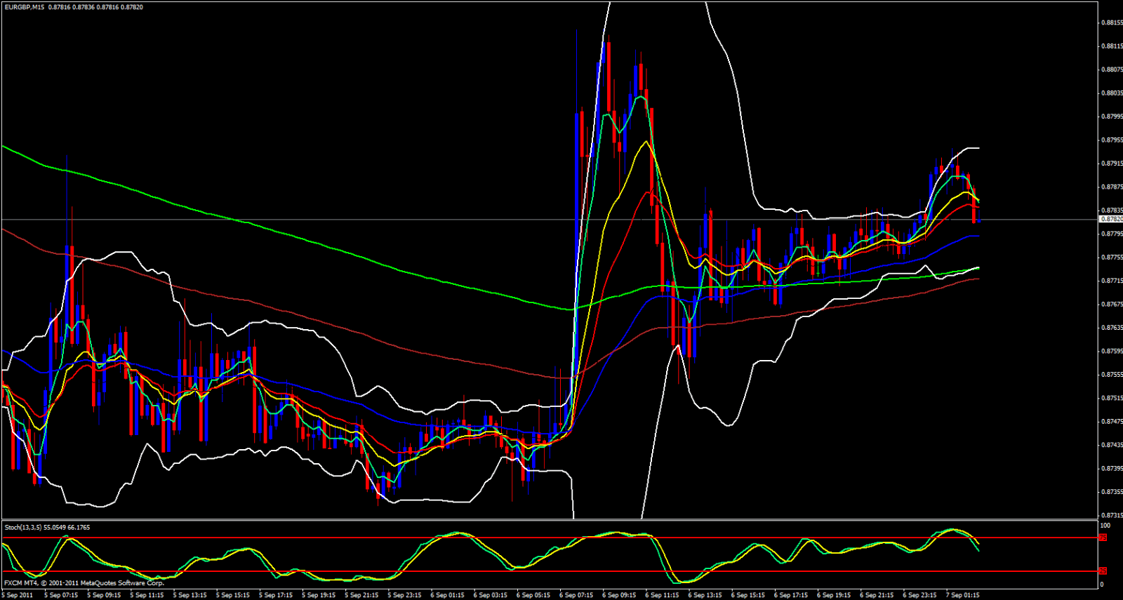 Glancing at the 15 Minute chart I see Stochastics has crossed to the downside from the overbought zone and the 5 ema is crossing through the 13 and beginning to look bearish. Taking all this into consideration I now want to point out that price is up against the monthly Central Pivot Point 0.8790, the weekly Central Pivot Point of 0.8793. At this time we are just above the daily Central Pivot Point 0.8776 and I will wait it out to see if we bust through it. If we were to bust it I would expect a bounce off the 0.8765 level then to head back up to the CPVP of 0.8776 to take a short on this pair. I would set my stop at around 0.8795 or optionally just above the psychological level of 0.8800 and set my profit target at 0.8750 area which is the daily and weekly M2 area.