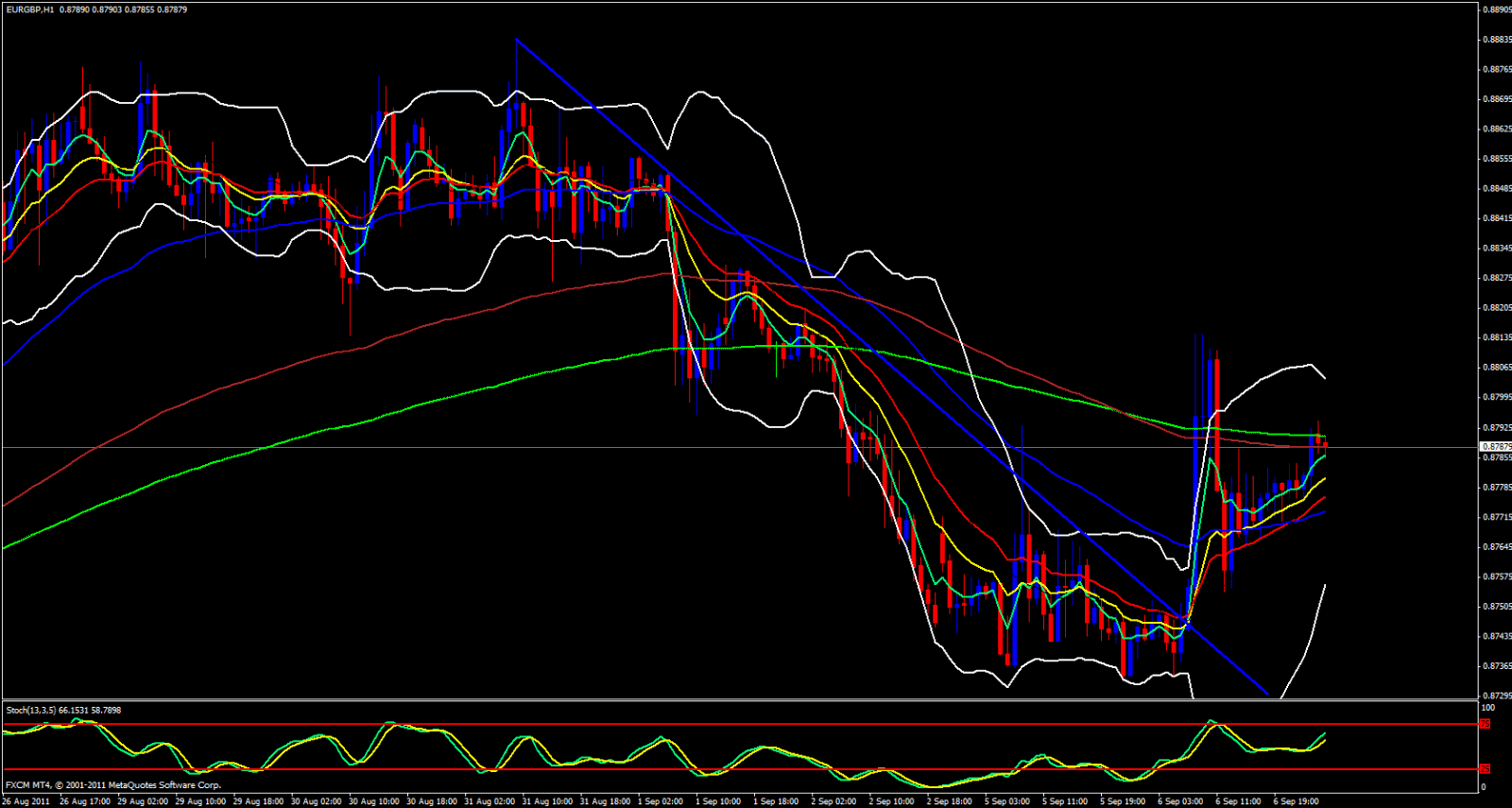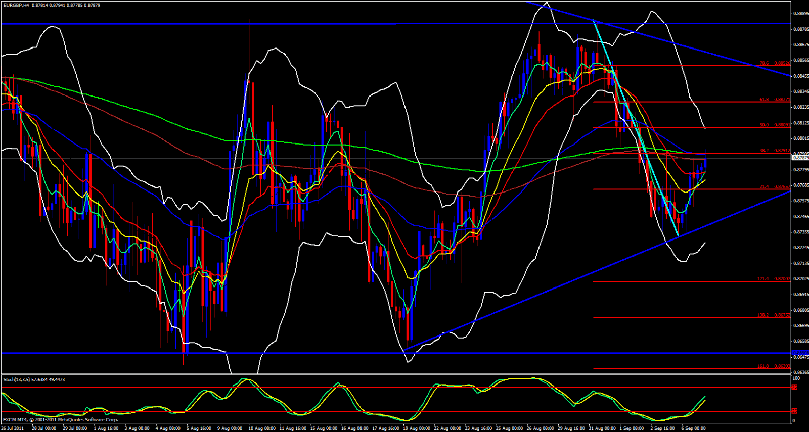 I am looking at the EUR/GBP today and I cannot help but to think GBP strength. Looking at the 4 Hour chart we are at the 38.2 Fib zone of the recent fall for this pair, overlapped with the 55 and 144 emas just above price. Also note that the upper Bollinger band is pointing downward.