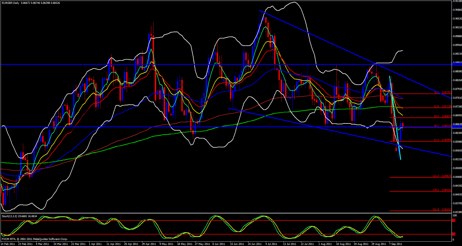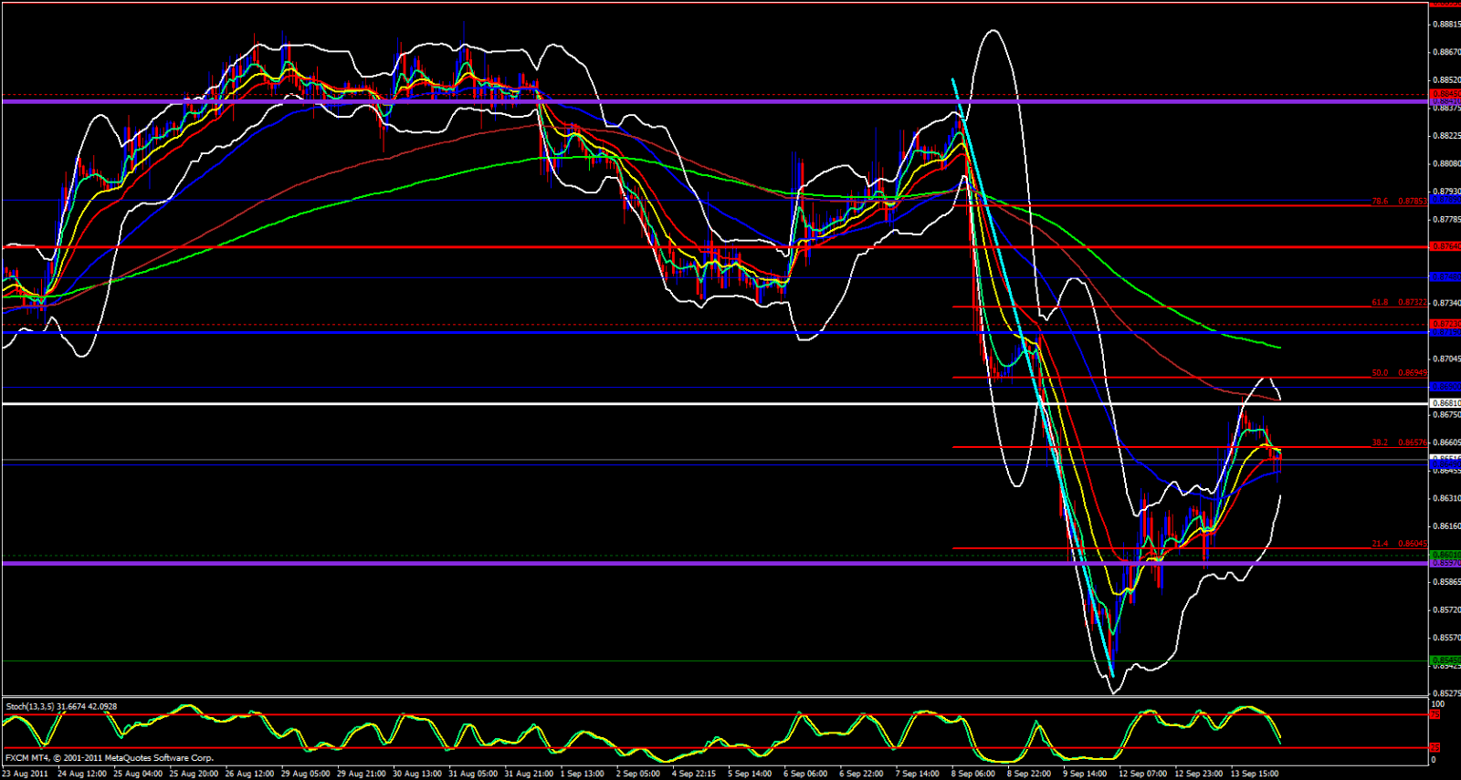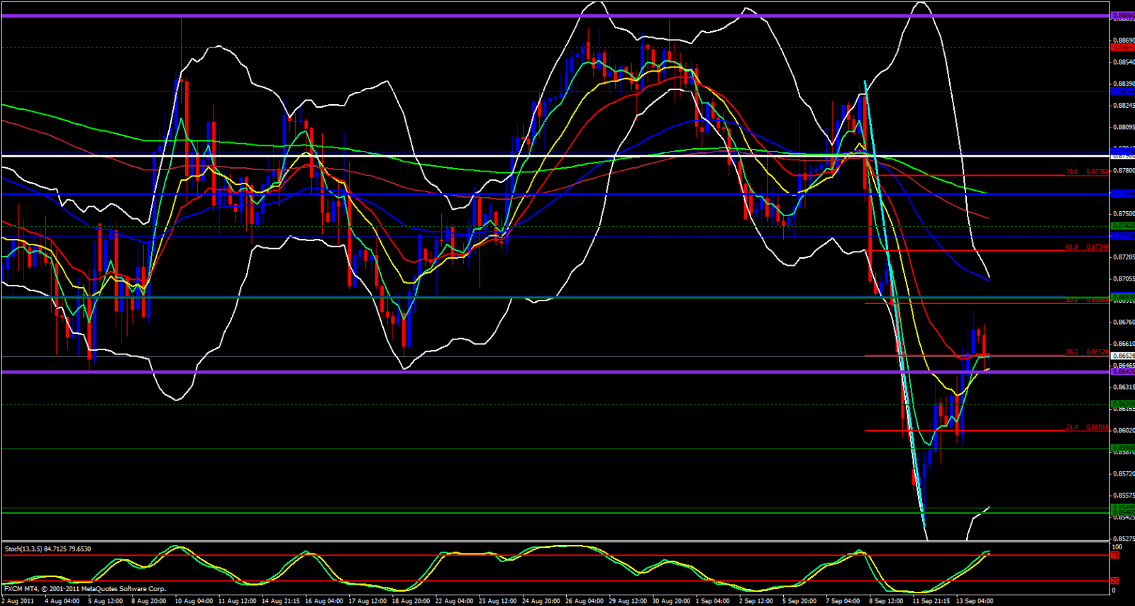 While looking at the 4 Hour chart it looks as like price could ride its way back up the 5 ema to the 0.8690 area which would be an excellent area to take a short since it would be at the 50.0 Fib Level as well as the Monthly S1, however, if price doesn't make it up that far then I will be prepared to take a short when the 4 hour 5 crosses below the 13 ema and Stochastics is in the overbought zone and looks like it can cross back down soon.