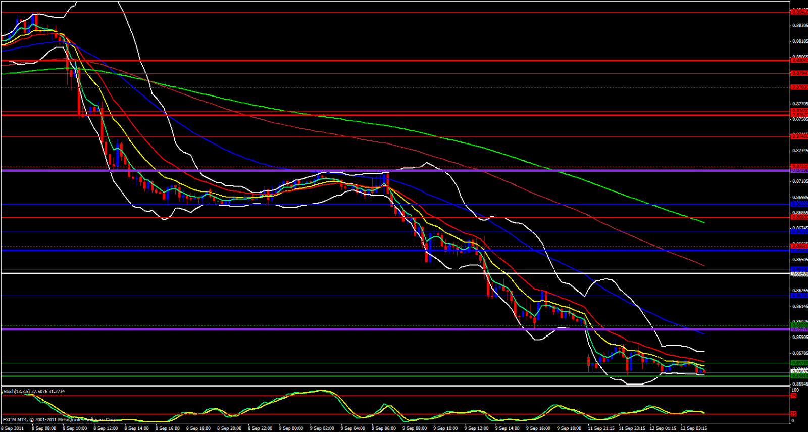 On the 4 Hour we are about 26 pips away from the 5 ema and I expect that 0.86 should be a strong area of resistance and a good place to look at further shorts. If taking shorts at 0.8600 set a stop at around 0.8625 and look for a profit target 0.8560.
