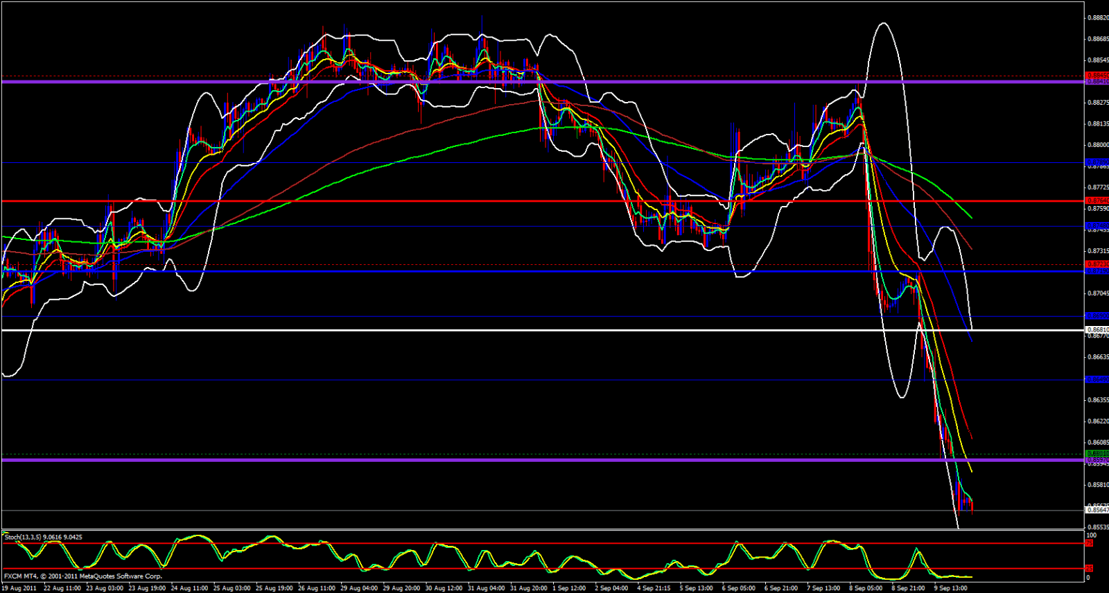 Looking at this pair I see it is approaching the Weekly 144 ema and at the edge of the Lower Bollinger Band. Viewing the daiy chart price is outside of the Bollinger Band, about 70 pips away from the Daily 5 ema and in the oversold zone of the Stochastics.