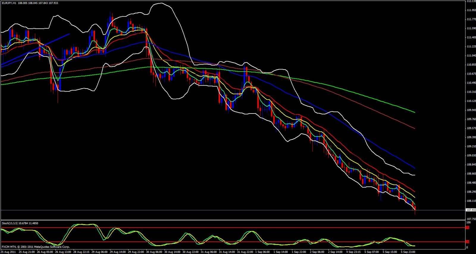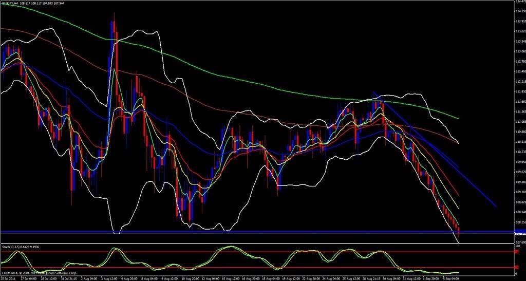 The eurjpy continues to look perfectly bearish. There is absolutely no reason to considering anything but short positions with this pair. This pair is gracefully riding the ema's on all time frames from the weekly all the way down to the 1 minute. At the time I am analyzing this pair I see it is up against the August low of 108.01 with the 4 hour 13 ema just a bit above it and it looks to me it will crunch this pair down below the low.