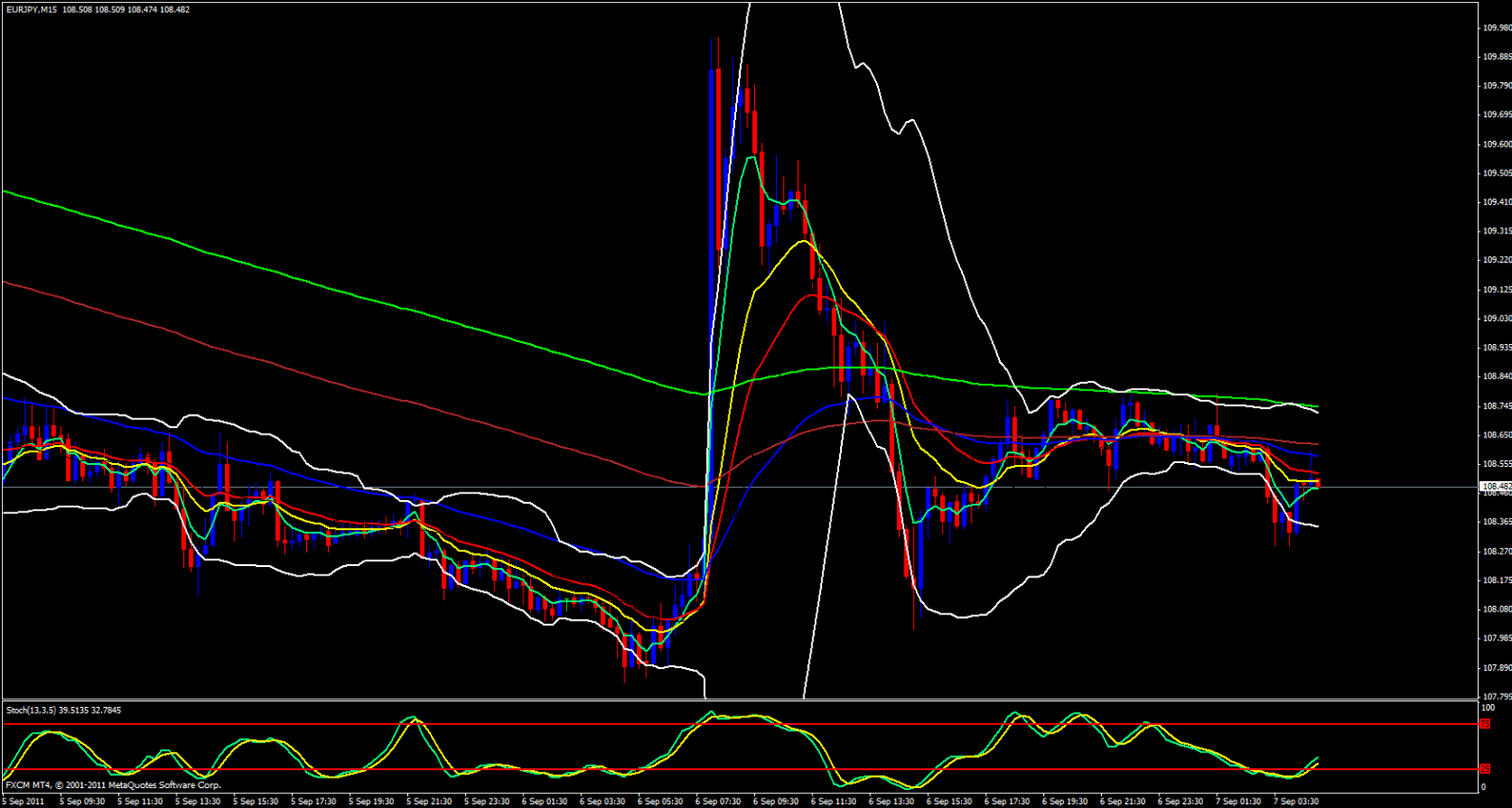 Looking at the 15 minute chart of this pair I see that the bollinger bands are narrowing and the ema's are braiding. This to me is a sign of low volatility for this particular pair.