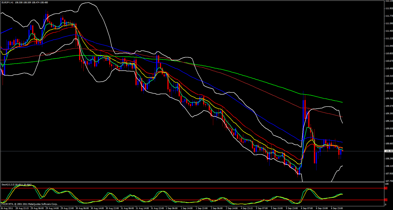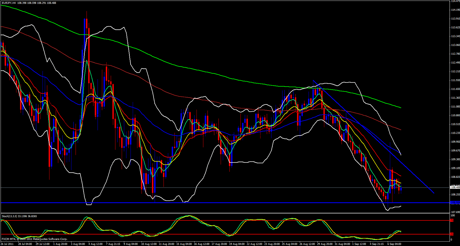 For me to analyze this pair I must always look at the USD/JPY as well as the EUR/USD pairs because of course the EUR/JPY is simply the EUR/USD x USD/JPY. With that being said I am seeing some evidence that the USD/JPY may become a bit bullish since the USD/JPY recently double bottomed just above the weekly M3, a bullish sign to me which points to JPY weakness with this pair, and of course in my EUR/GBP review I did point out EUR weakness and I have recommended EUR/USD shorts. With all this being the case we would be basically looking at a weak EUR and a weak JPY. Generally, when we trade the markets we want to pair together a weak currency with a strong currency. What is the point of pairing together two weak or strong currency's together when we can pair together a weak with a strong and trade accordingly with an edge of some degree? So, when I am looking at both the weekly and daily charts of this particular pair I see priced crunched in between the lower Bollinger Band and the 5 ema.