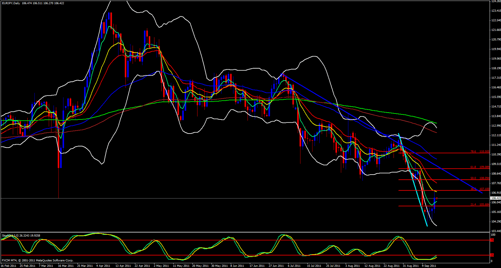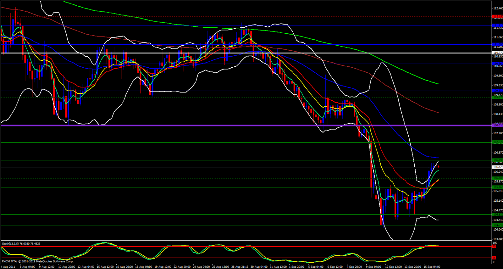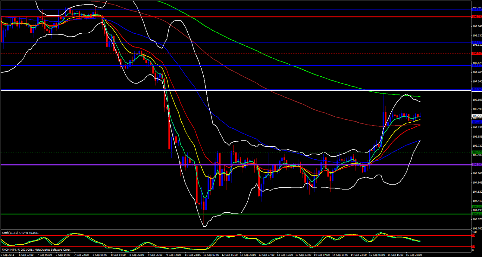 Moving over to the 4 hour price is riding the 5 ema up and the upper Bollinger Band is wide open pointing up but we are approaching the 55 ema so there will be a bit of a fight around 106.77 Looking at the hourly we are also riding the 5 with the 13 just underneath to back up the 5 and the 21 is beginning to catch up to the 144 ema. Lower Bollinger Band is pointing up but the upper is not. Today's session does start out above the Daily Central Pivot Point and the 15 minute Bollingers are a bit narrow but the upper Band looks like it wants to open. This pair is bullish but has a lot to contend with which may cause ranging conditions.