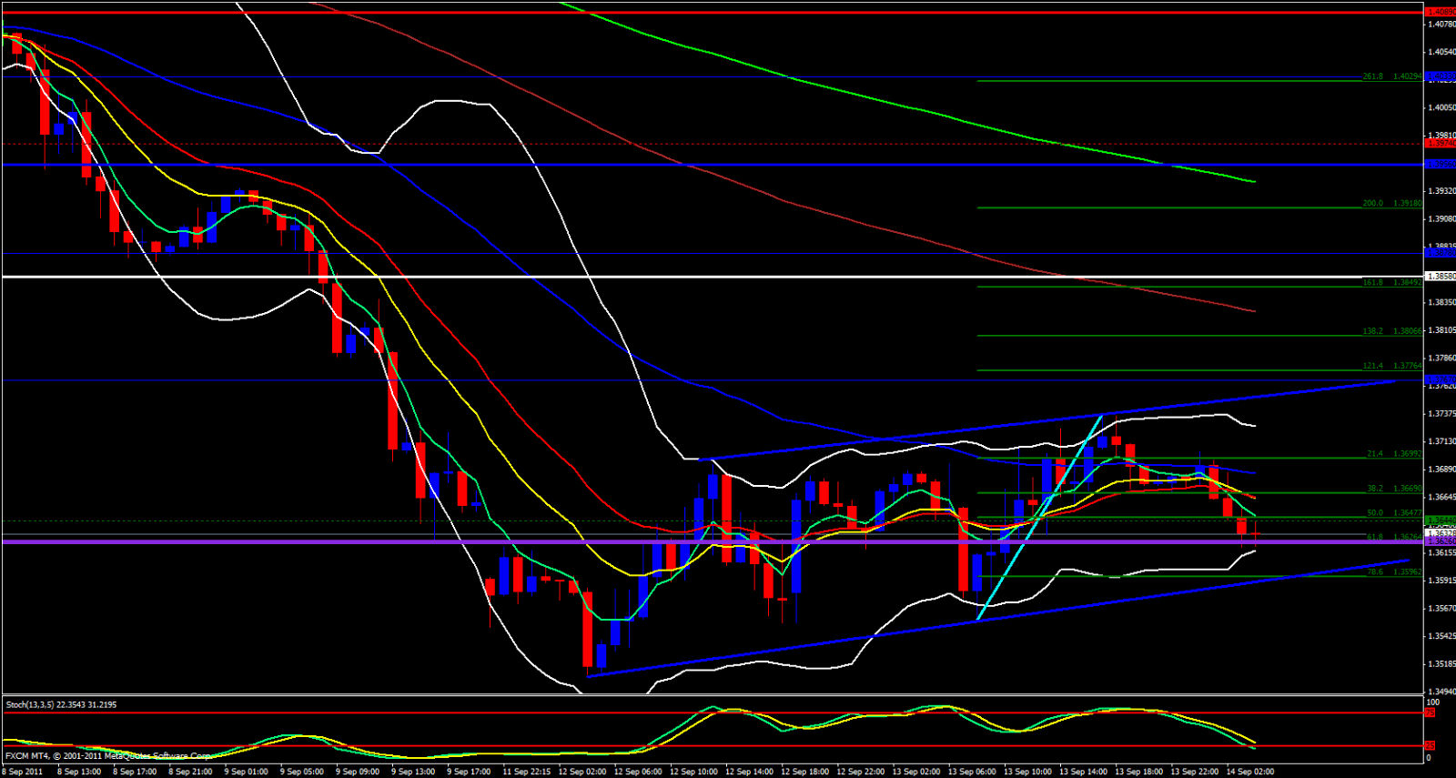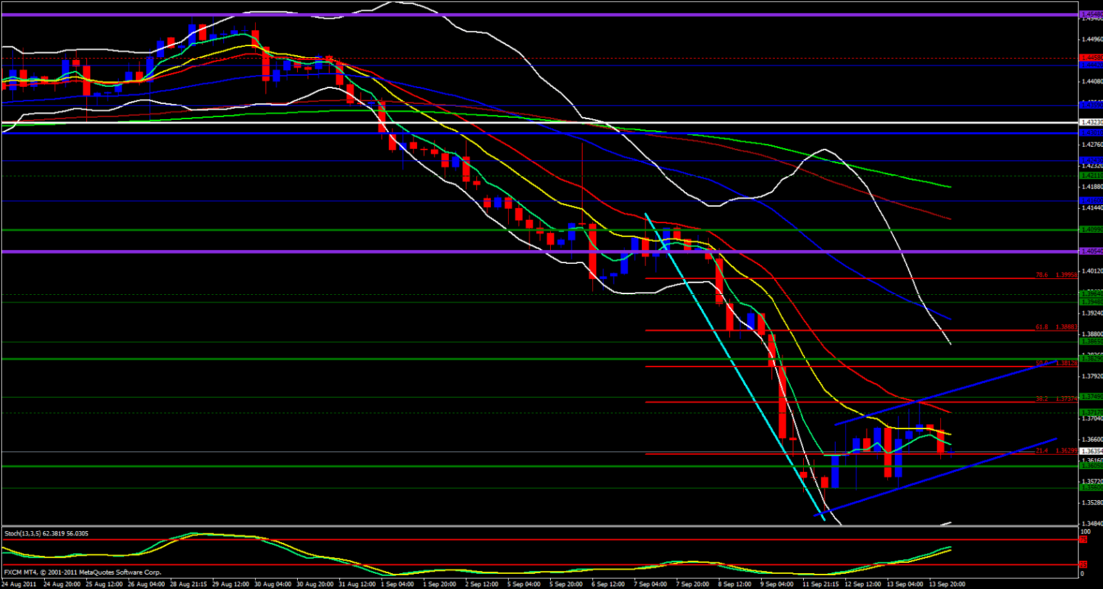 On the 4 Hour Chart which is the chart I use to plot my monthly Pivot Points it appears to me that price is in a bit of a price channel yet towards the bottom within 35 - 40 Pips. If price reaches the bottom of this channel that would put us at around 1.3605 which overlaps with the Monthly S3 On the Hourly Chart which is the chart I use for my Weekly Pivots Last week's low is around 1.3626, close enough to the 1.3605 level and the lower Bollinger Band is around the 1.3615 region so I would start watching that area for price to bounce off of if considering a long off the bottom channel and keep in mind Stochastics is in the Oversold zone. If price breaks 1.3590 look for shorts to 1.3555 area.