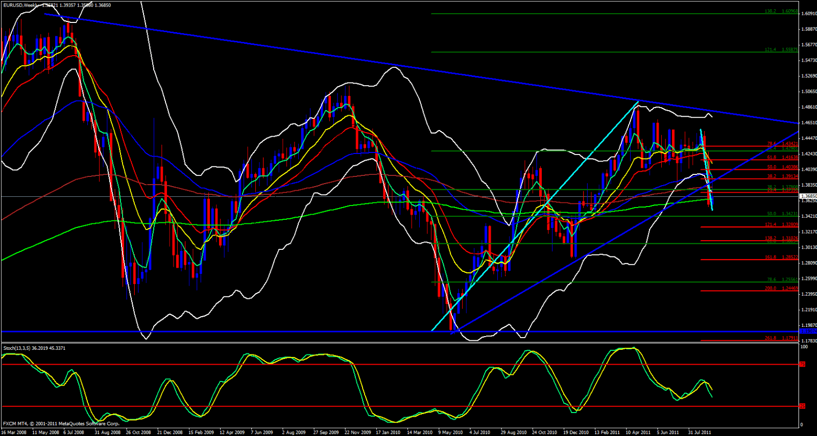 Looking at the Monthly Chart it is apparently obvious that price has broken a Trend Line, however, as it broke the Trend Line it also poked through a 55 ema that just happens to be in the zone between the 38.2 and 50.0 Fib of the recent rise. This by no means that price is reversing but such a reaction should be expected. A Pull back to the break point is definitely in order. If price poked the 55 once then bounced, the next time it is more likely to break the 55 and I can see it heading down to the 144 ema. Also, it must be noted that the Stochastics is in the overbought zone and is crossing down into the trade zone. I also want to point out that the Monthly ema's are rolling over and the 5 looks as though it is poised to cross the 13 and 21 ema's.