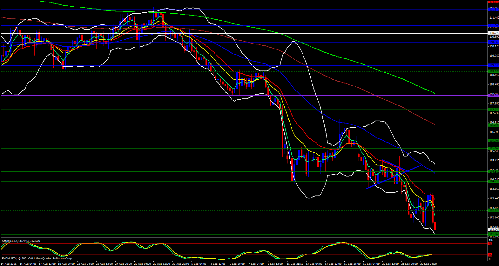 I start my analysis on this pair looking at the USD/JPY and I am observing that the USD/JPY appears quite bearish on all time frames. On the weekly it is riding the 5 ema downward, on the daily the 21 ema seems to have been in control the 4 hour 5 ema is sharply crossing below the other ema's as well as with the hourly and 15 minute so the USD/JPY is no doubt bearish which means we have a strong JPY and a weak USD. In my EUR/USD analysis I state that the EUR/USD is bearish, but, could be facing a possible retracement which may cause temporary USD weakness, which adds to the USD weakness against the USD/JPY but also means that the JPY will be strong and the EUR will be strong so I am not sure if I would want to trade this pair just yet. I do not want to trade two currencies that are both strong. If the EUR/USD maintained its bearish trajectory this would mean a weak EUR then I would consider pairing a weak EUR with a strong JPY considering the USD/JPY would continue bearish then I would look to short the EUR/JPY. On the weekly chart this pairs looks just as bearish as always, price is riding the 5 ema, lower Bollinger Band is open and pointing down as it has been for the last few weeks. On the daily the same conditions appear and the correlation between the EUR/JPY and the EUR/USD is very strong and both pairs look very similar technically speaking. On the daily we riding the 5 yet within the Bands but against the lower band and an oversold stochastics and a gapped from the daily 5 ema retracement is imminent.