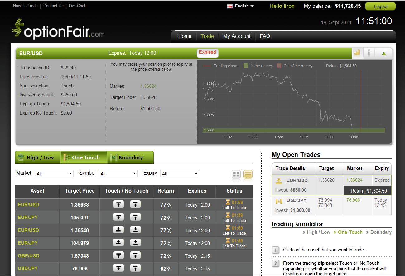With optionFair™ binary options trading platform, I traded $850 on the “Touch down” instrument. This kind of option has a return of 77% if the option touches the strike price prior to expiry, which means that if the signal is correct, I could get a return of $654.5 on my investment. The market price for EUR/USD at the buying time (09:50) was 1.36691 and the target price was 1.36628. Surprisingly the EUR/USD price hit the strike price in less than a minute, and I won the position, earning $654.5 in less than a minute.