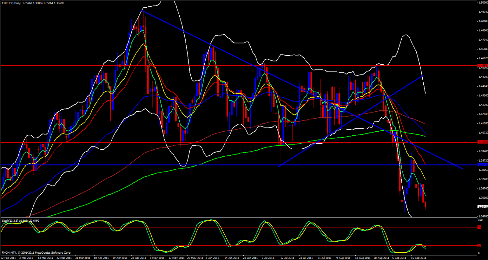 On the weekly chart we are once again outside the lower Bollinger Band, we have entered the oversold zone of the Stochastics and we are 270 pips below the 5 ema. On the daily chart we are also in the oversold zone of the stochastics and we are also gapped a bit from the 5 ema.