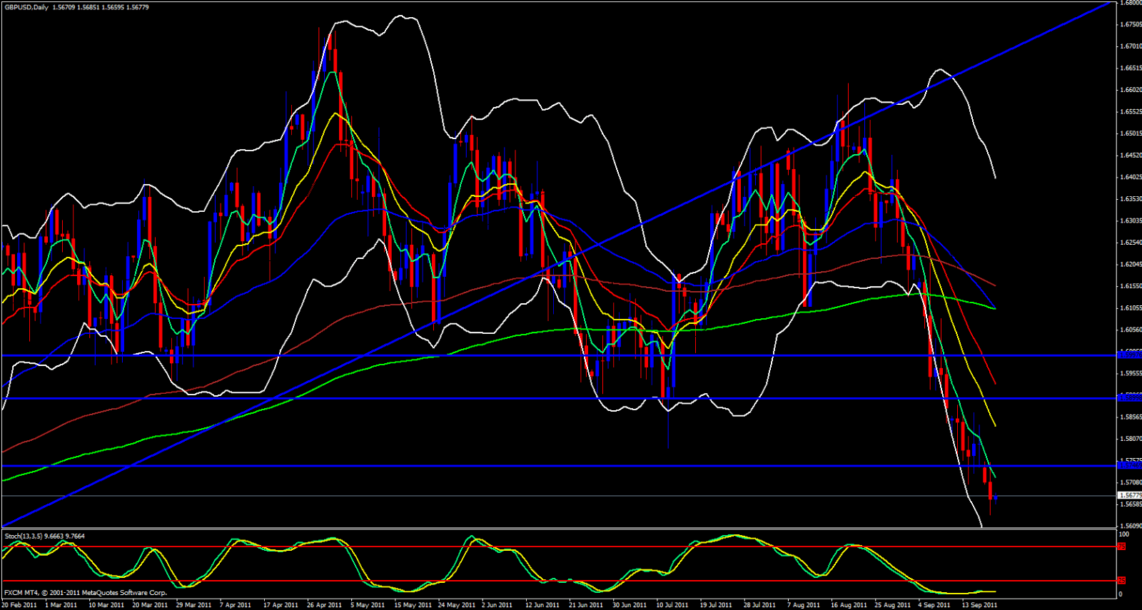 Now, looking at the 15 minute chart I see that the 5 has crossed above the 13 and the 21 ema's and the upper Bollinger Band is pointing upward giving price permission to head up. The Daily 5 is at 1.5720 but will come down a bit because price will drag it down, and at the 1.5708 region we have the 15 minute 144 ema, and at the 1.5720 region we also have the hourly 55 ema and the 4 hour 13 ema is on the 1.5713 area. So I think it is likely for price to head in that direction, somewhere in between 1.5710 - 1.5720 region then drop from there.
