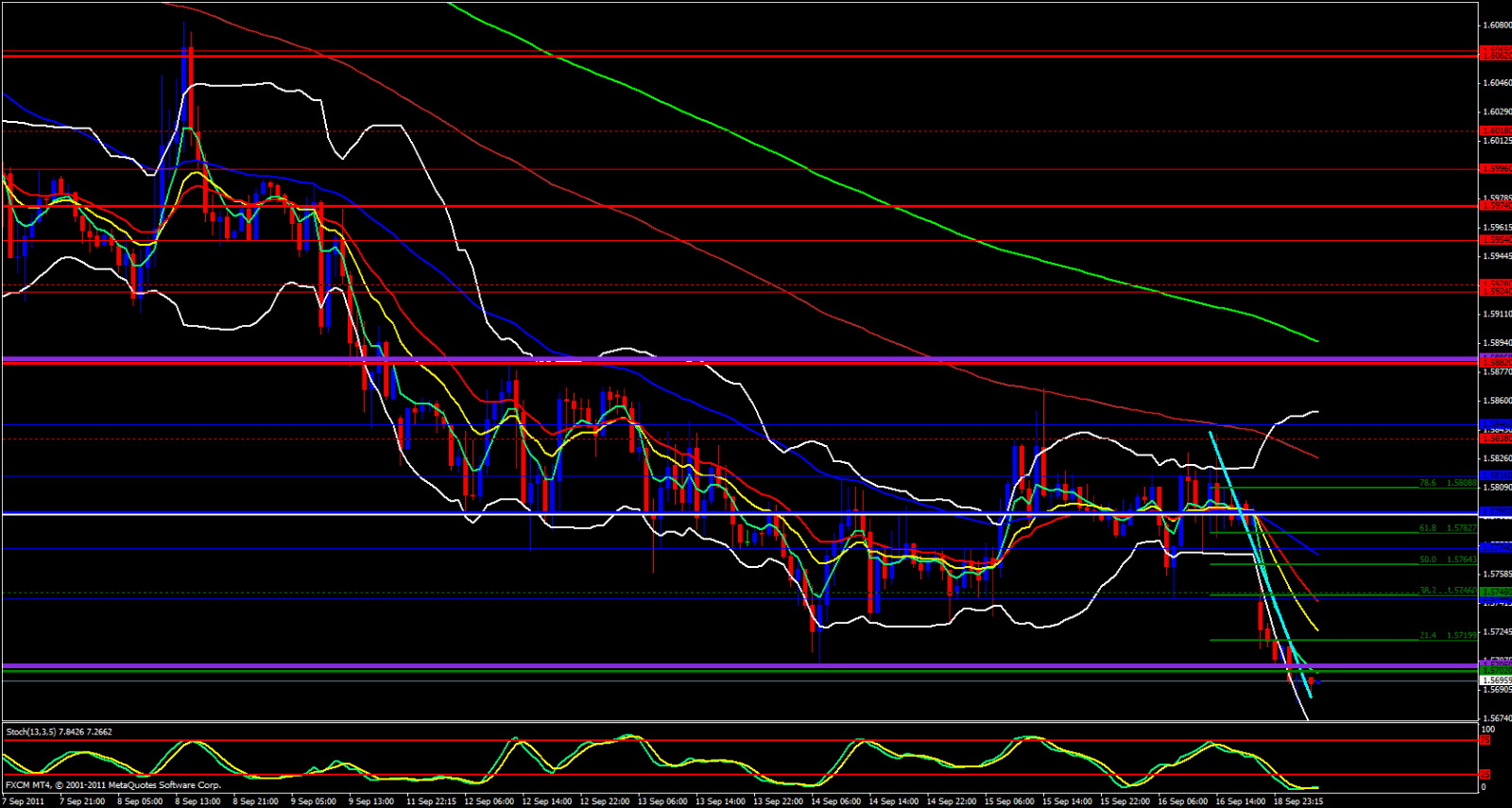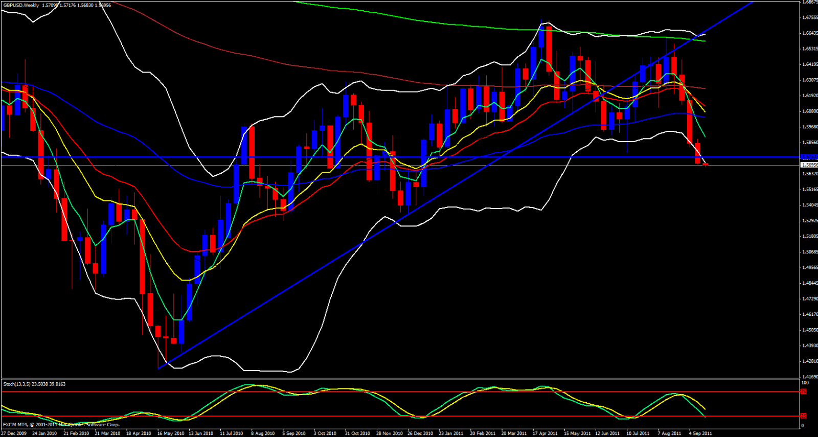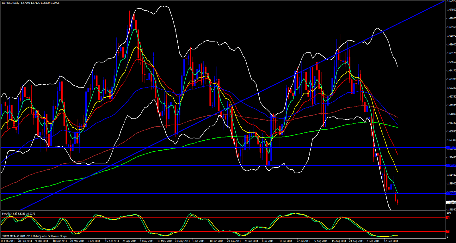 Looking at the daily chart price is gracefully riding the 5 ema downward. Price is about 45 pips below the daily 5 ema. Movind over to the 4 hour chart price is slightly outside of the lower Bollinger Band and about 30 Pips away from the 4 hour 5 and a few pips above that is a descending trend line. On the hourly the 5 ema has just crossed below Fridays low. A 38.2 fib of the recent drop would put us at around 1.5746 which coincides with the weekly M2 as well as the hourly 21 ema and this level had been support last week so following role reversal logic this area should be a very strong area of resistance so if price were to reach even the 1.5740 region I would be looking for reasons to take a short with a stop loss not much more than 20 pips away.