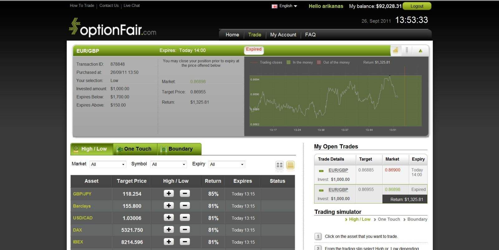 With optionFair™ binary options trading platform, I traded $1,000 on a “Low” instrument. This kind of option has a return of 70% if the option expires below the strike price, so if the signal is correct I should see a return of $700 on my investment. The market price for EUR/GBP at the buying time (13:42) was 0.8688.