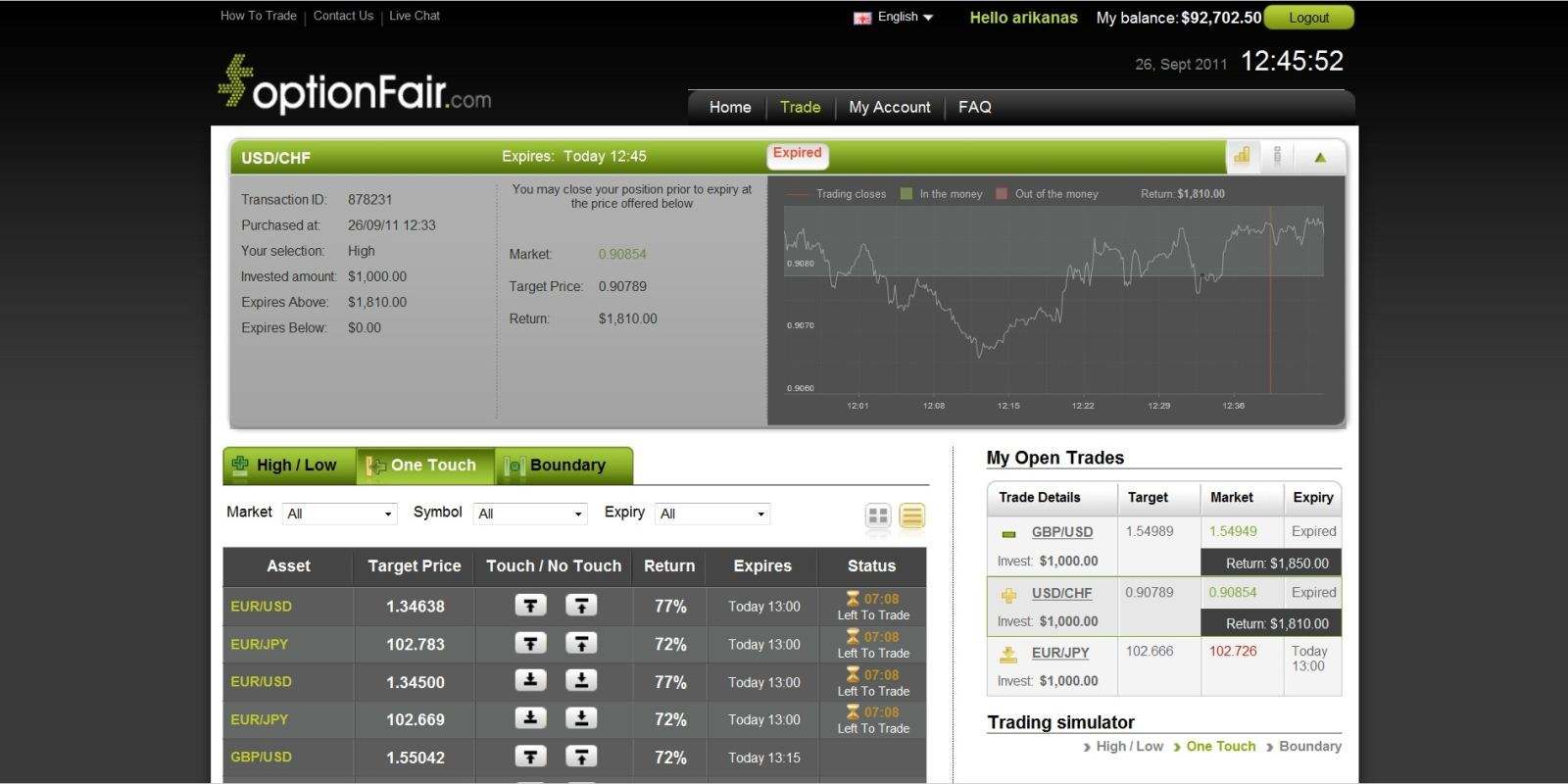 With optionFair™ binary options trading platform, I traded $1,000 the “High” instrument. This kind of option has a return of 81% if the option expires above the strike price which means that if the signal is correct I could get a return of $810 on my investment. The market price for USD/CHF at the buying time (12:33) was 0.90789. The option expired at 12:45 with market price of 0.90854.