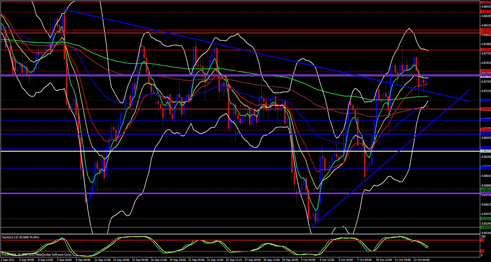 On the 4 hour price is slightly below the 21 and 55 ema's but they are so close together because there really has not been a lot of volatility from the 4 hour perspective. On the 1 hour we are looking bearish. All in all, it does appear the GBP is weaker than the EUR and I have not even looked at the EUR/GBP chart just yet.