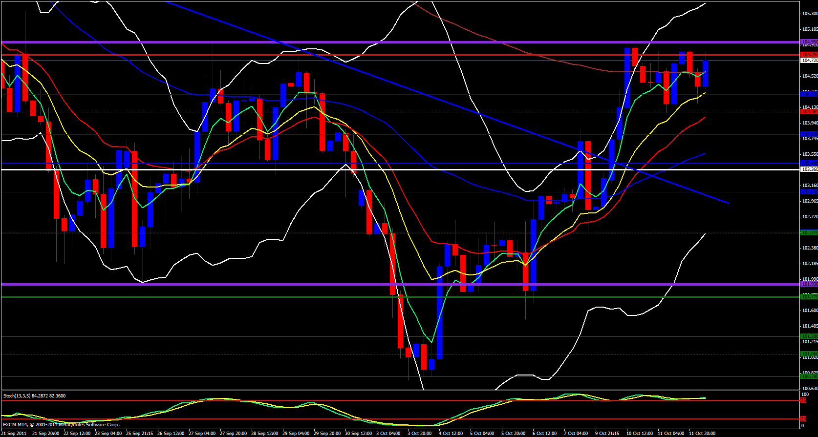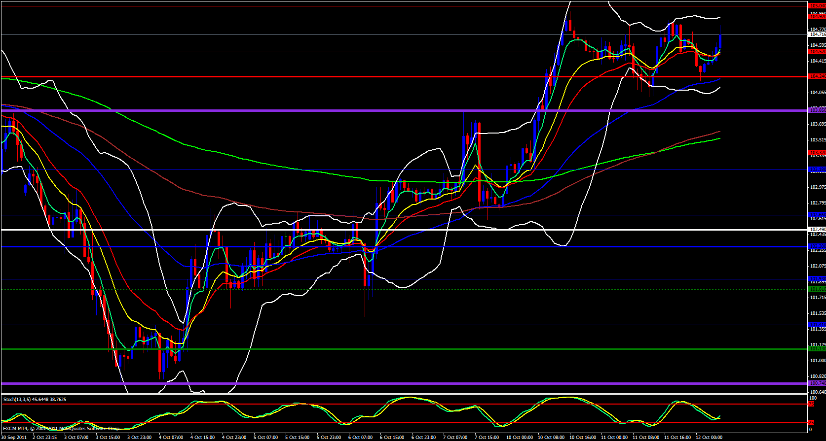 Moving onwards to the 4 hour chart it is obvious price is riding the 13 ema but we are approaching last month's high. The upper Bollinger Band is open and pointing up, a clear sign of high volatility I believe we can break last months high but there will surely be a fight at the 104.95 price level. 104.92 just happens to be the weekly M4 and it is overlapped with a 138.2 fib extension of last weeks range so there is no doubt there will be a bit of resistance in this area but I do believe this resistance can be broken. The stochastics is in the trade zone pointing up. A break above 105.10 will make me comfortable to enter a long. Try to time it with the EUR/USD if it breaks 1.3700 at the same time EUR/JPY breaks 105.10 it could be a nice break for both pairs.