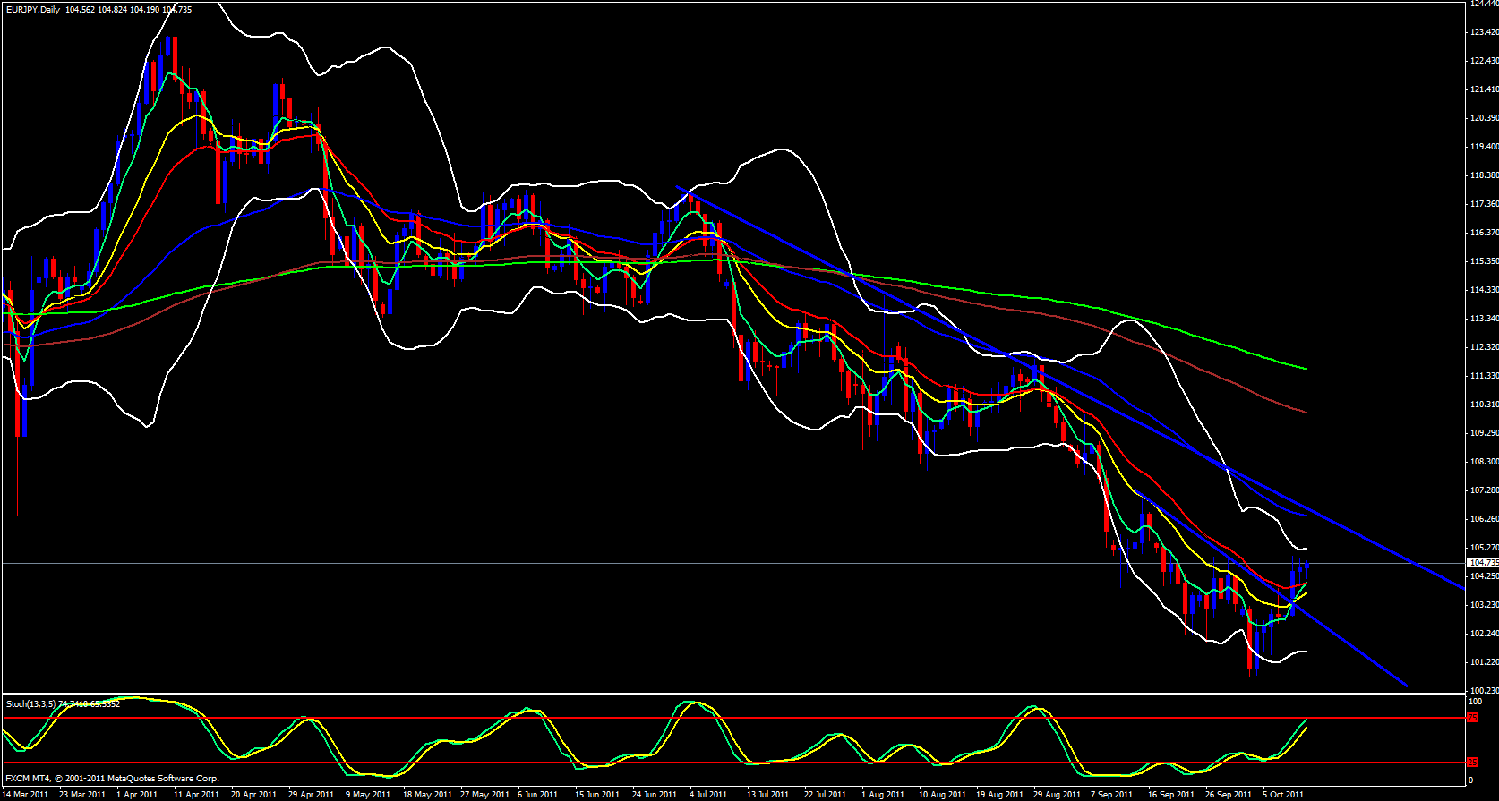 I really don't like to sound redundant, I don't like repeating myself too much but I just cannot seem to keep repeating the similarity between this pair and the EUR/USD. It is no secret that the correlation between the two pairs has always been rather strong. On top of that the USD/JPY continues to be range bound so that helps this pair out as well. Briefly looking at the weekly chart I see that the stochastics is in the oversold zone looking to cross up, price has bounced off the lower Bollinger Band and angle and separation between the ema's is diminishing. Just like on the EUR/USD chart this pair has also broken its trend line and the 5 ema has crossed above the 13 and is beginning to cross above the 21 ema and the stochastics is pointing up.