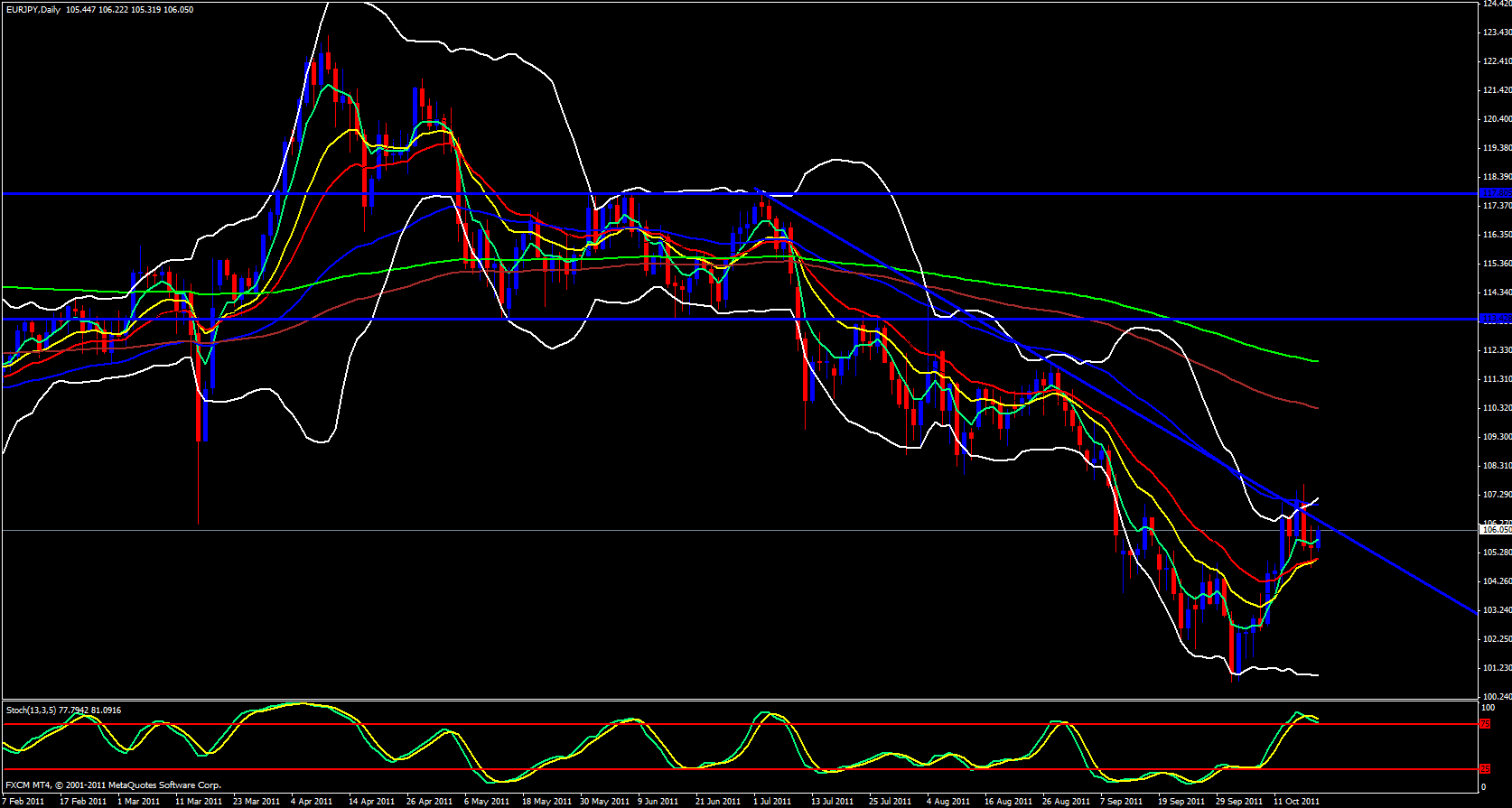 I start out with this pair looking at the weekly chart and it is obvious that price recently made a 38.2 fib of the recent swing down, overlapped with a 38.2 fib. On the daily chart, we have fallen down below the descending trend line, however, price is still be supported by the 13 and 21 ema's underneath and the upper Bollinger band is wide open and pointing up just a bit. Price is definitely in an area where a decision will soon need to be made. Price is approaching the monthly R2 reversal pivot point around 106.38 and looks as though price is developing a complex top pattern could also be a Head & Shoulders pattern.
