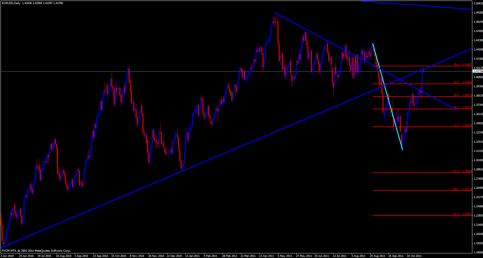 The stochastic has been in the overbought zone and it is looking as though it could cross down. looking at the naked daily chart I see that price is up against the bottom of a trend line. Either price will break this line and keep rising or it will fall.