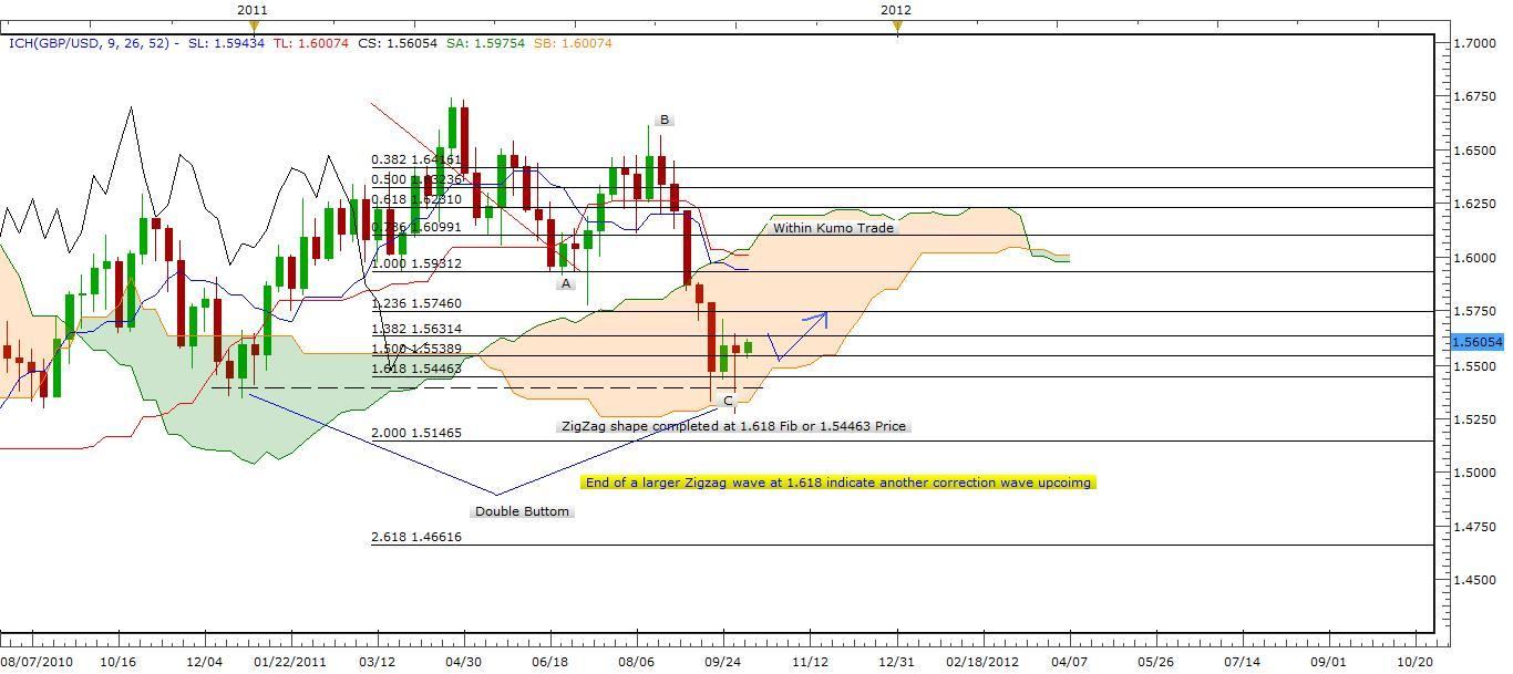 Looking at weekly Ichimoku Chart, We can notice that trend has entered the Cloud (Kumo) which tells us that we are going into a correction wave that makes me expect Zigzag, Flat, or combinations before trend leaves the cloud into another major trend. With a wide cloud width that informs a high volatility are possible in near future.
