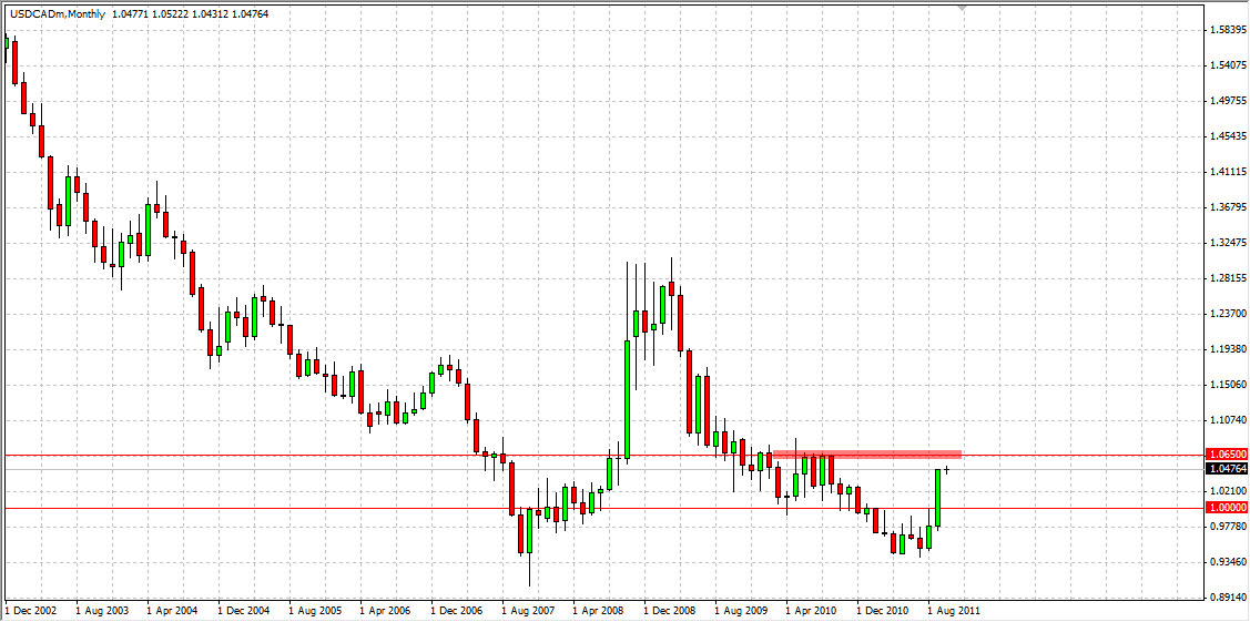 Looking at the USD/CAD monthly chart, we see the 1.0650 level as massive in its importance. Notice how the September candle has been a straight shot up – these types of candles mean something, as they close at the top of the range. This means that traders are dumping the CAD in droves at this point as the candle is so long. It isn’t often we see these candles on a monthly chart, and this should make you stand up and take notice.
