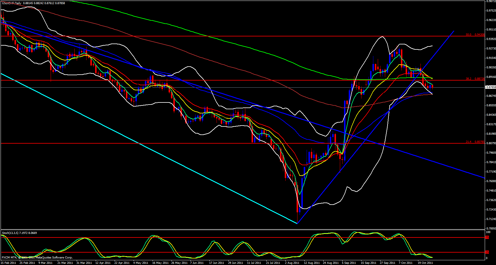 On to the hourly chart also the weekly pivot chart price is below the M2 at 0.8808 and we have had some ema crossovers to the downside and price is now riding below the 5 ema. I also want to note that the lower Bollinger band is pointing up but we have a ways to go before we get to that area.