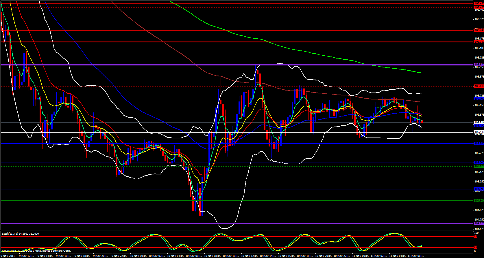 On the 15 minute chart price is in a tight range and price is just above the daily central pivot point at 105.44 which overlaps with the weekly M0 at 105.45 .