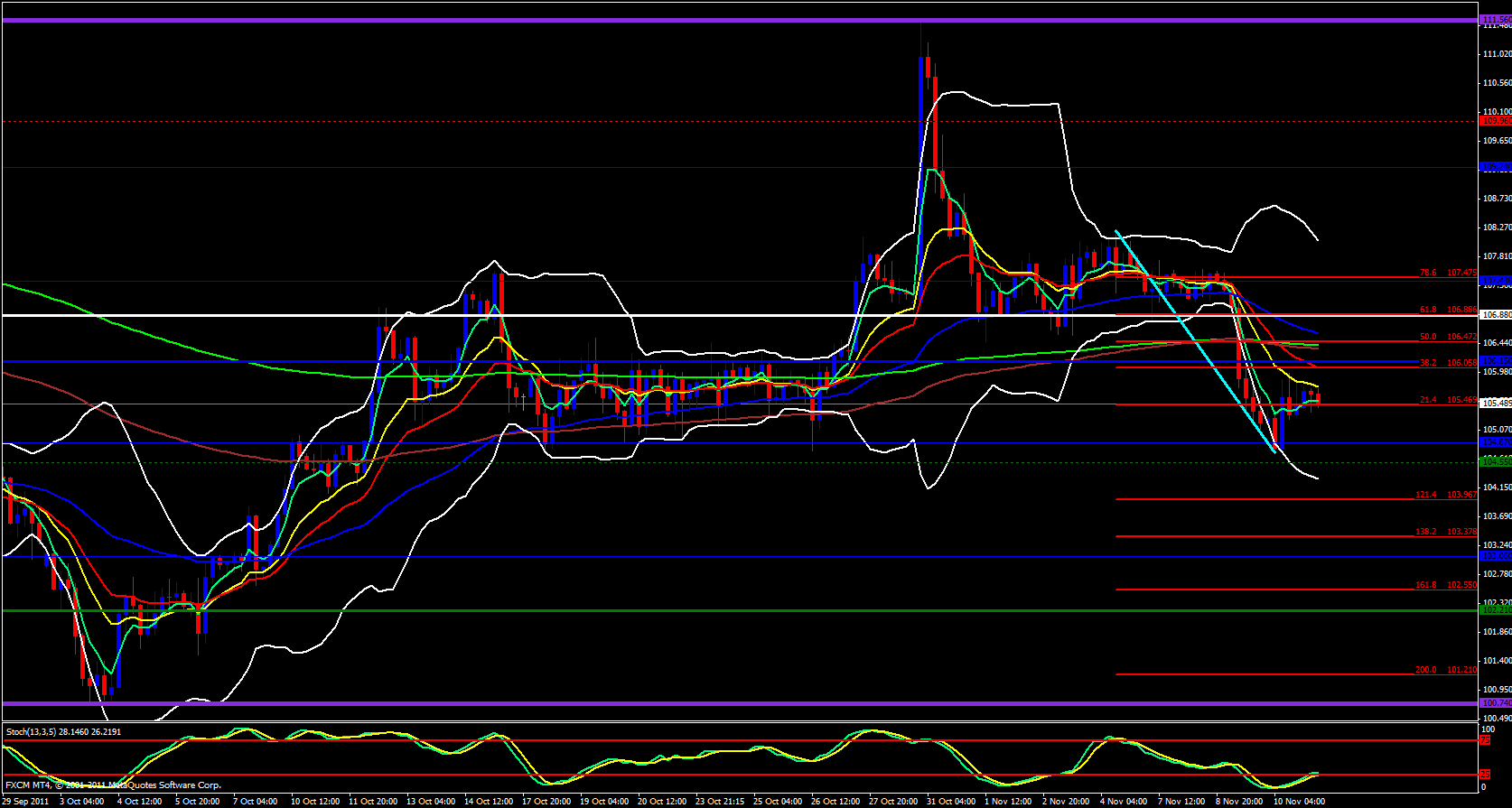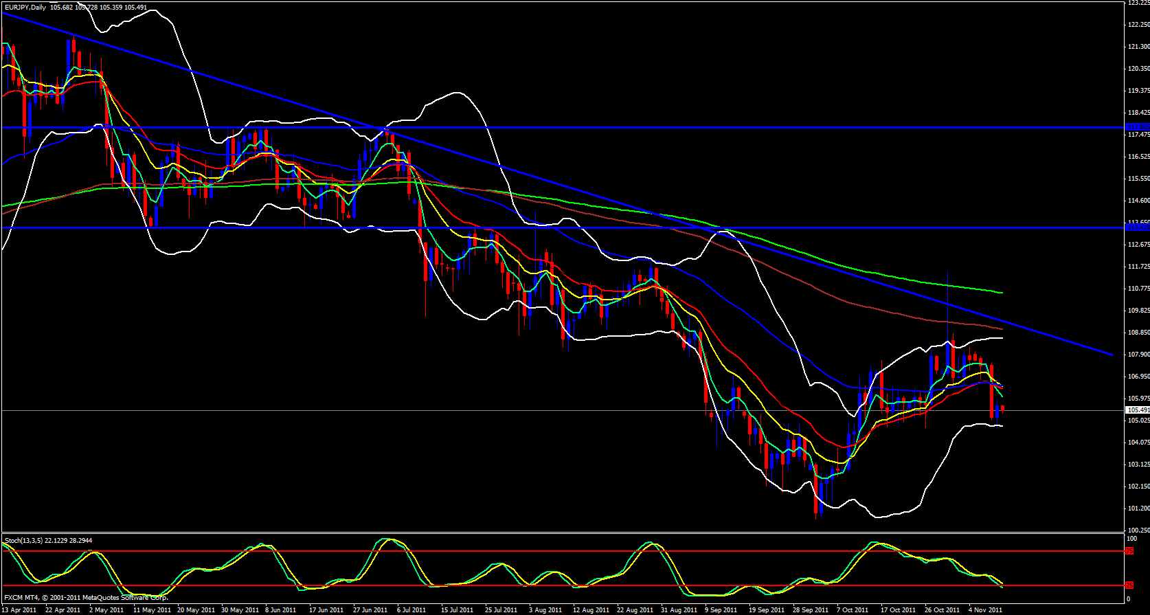 I begin EUR/JPY pair with the daily chart. Price has broken a trend line a couple days ago and price is just below the 5 ema and bouncing off the Bollinger band. The 5 ema is crossing below the 21 and 13 ema's and the stochastics is pointing down.