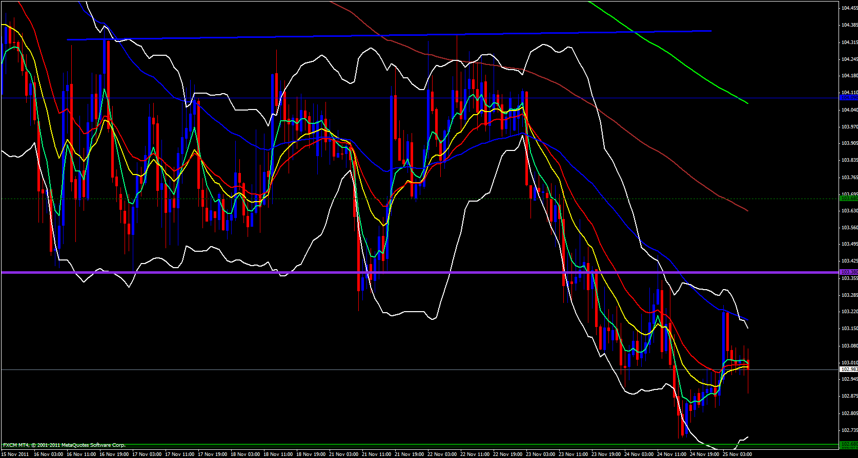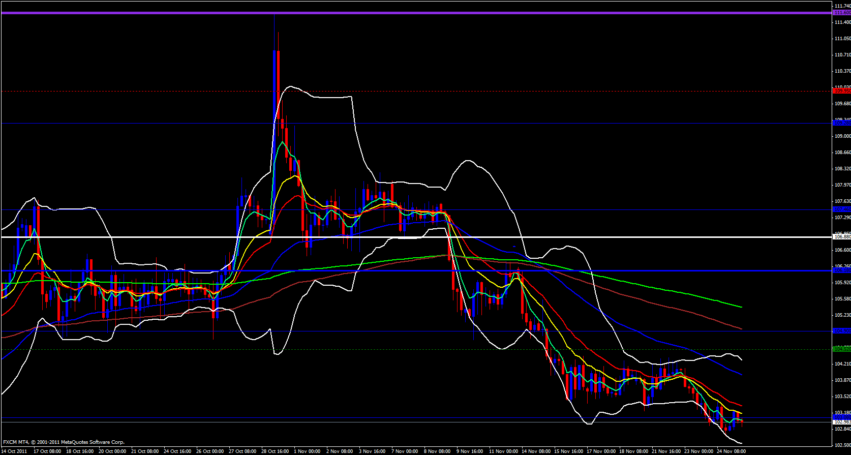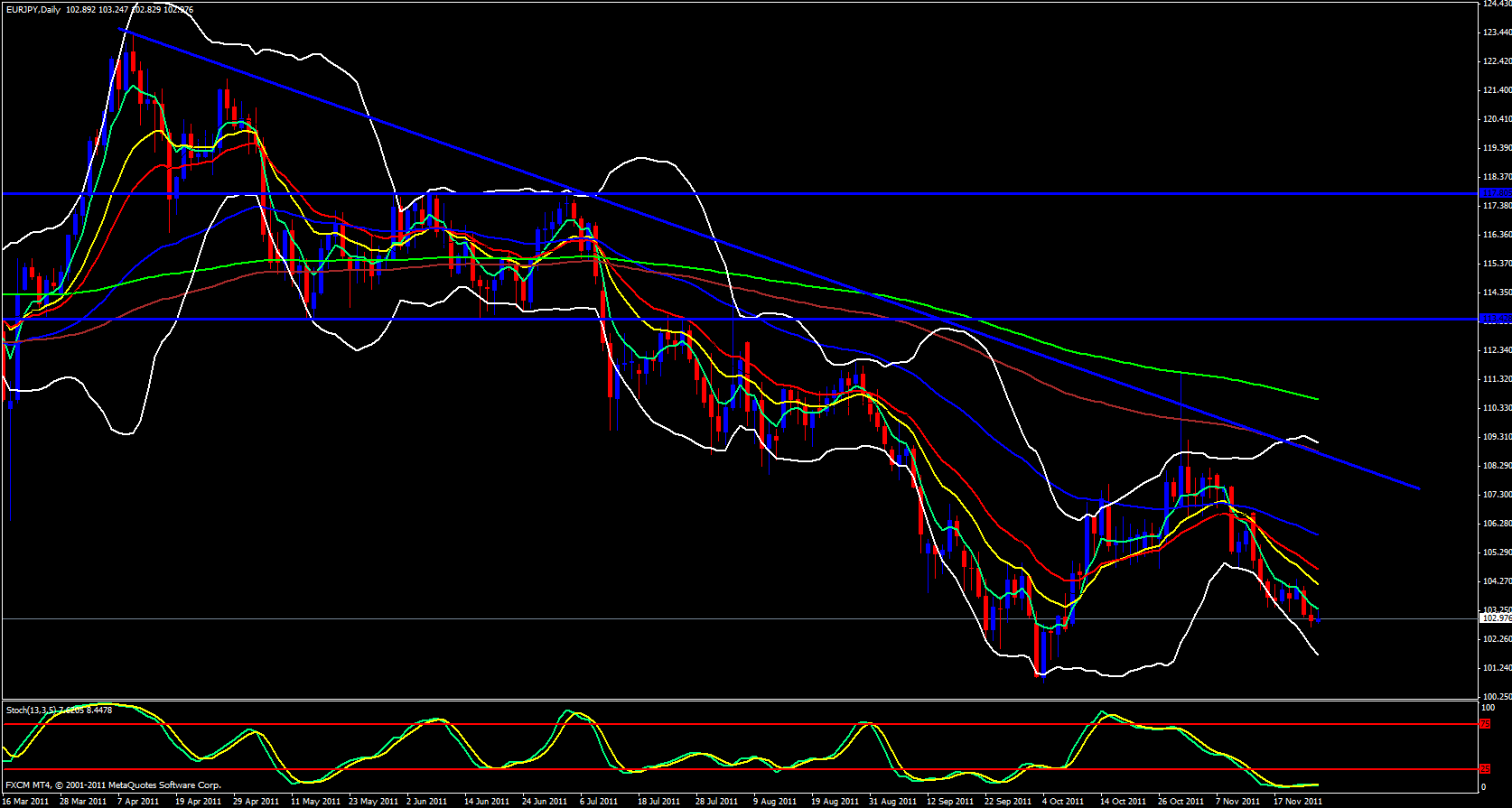 The EUR/JPY continues to ride the 5 ema down on the daily timeframe. Lower Bollinger band is open and pointing down.