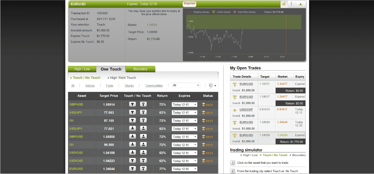 I placed $1,000 on “Touch” at optionFair™ Binary Options Trading Platform. This kind of instrument has a return of 77% if the EUR/USD touches the strike price prior to the expiry.I went in on this position at 12:02. The strike price for my position was 1.34559 for the expired time at 12:30. At 12:03 the price hit my target and I won $770 in just one minute!