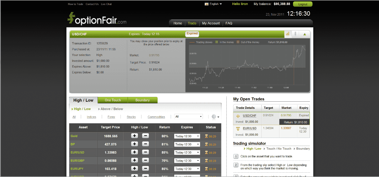 I placed $1,000 on “High” at optionFair™ Binary Options Trading Platform with the understanding that expires above the strike price, I will have a 81% re-turn, giving me $810 on my initial investment.
