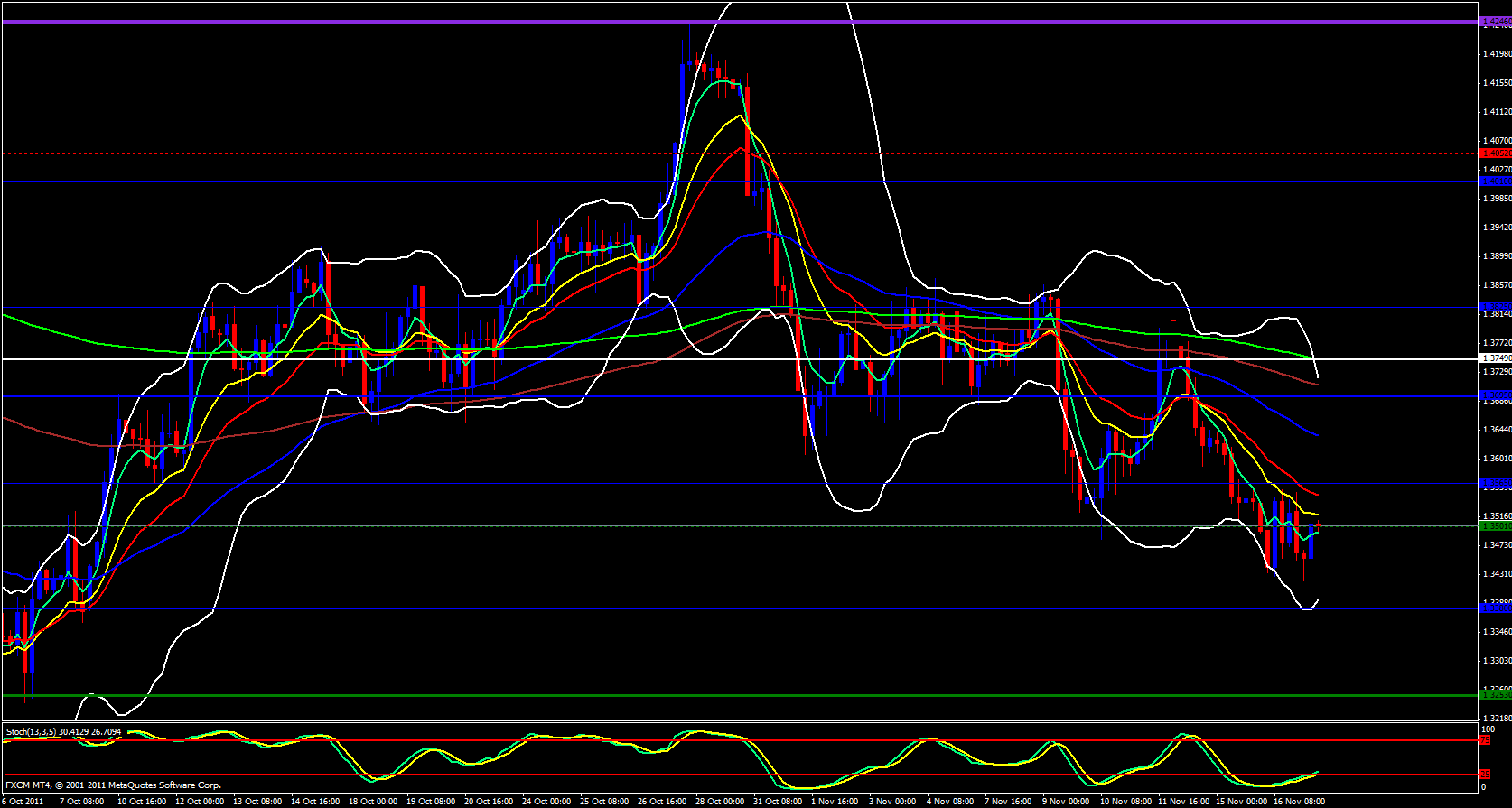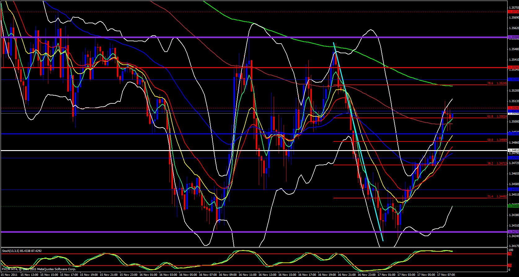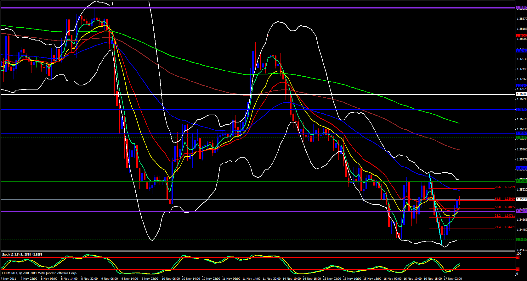 On the 4 hour timeframe price has been smoothly riding down along the 5 and 13 ema's with an occasional poke at the 21 so I will be watching for shorts between 1.3524 - 1.3544 since this is the zone between the 13 and 21 ema's and also coincides with the hourly 55 ema overlapped with a 78.6 fib of the last swing down not to mention the weekly S1 pivot at 1.3538 On the 15 minte timeframe the levels I just pointed out also seem to overlap with the 233 ema and the stochastics is in the overbought zone.
