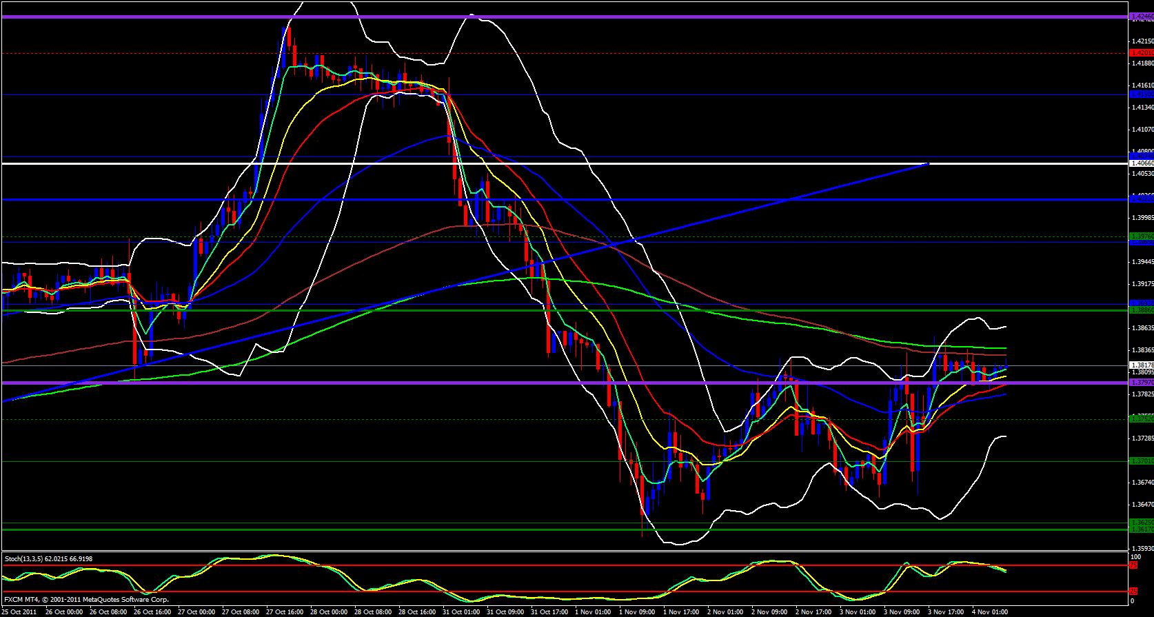 Moving on to the 4 hour timeframe we have already has an ema crossover of the 5 crossing above the 13 ema, however, the 55 ema is just above so expect a little resistance at around 1.3845.