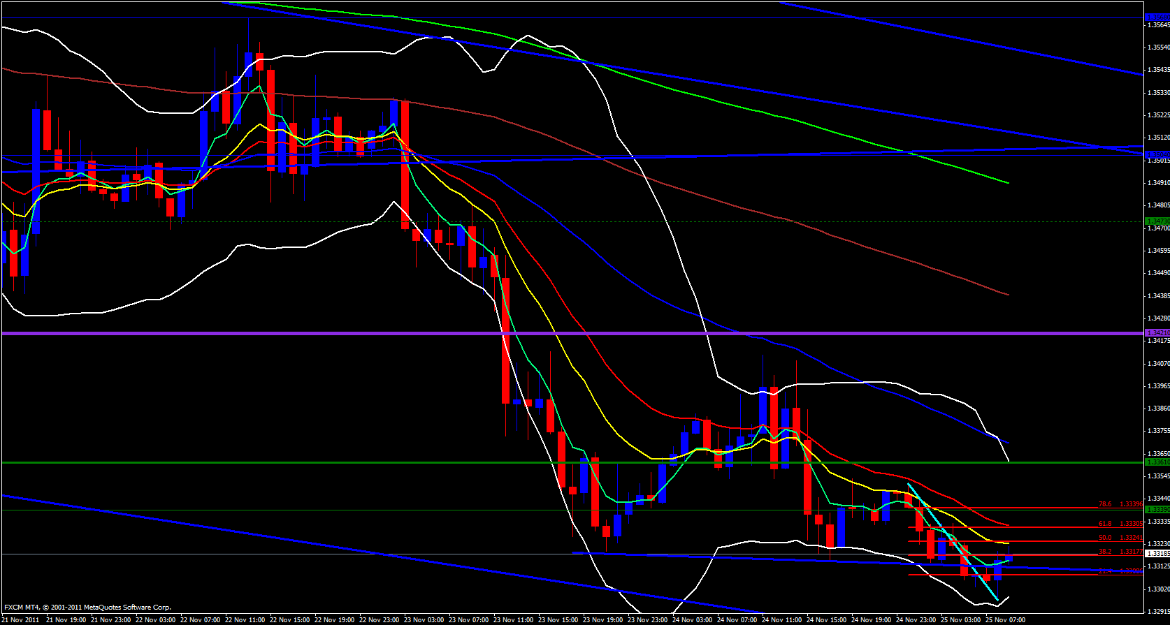 On the 4 hour timeframe price has been riding the ema's to the downside. On the hourly timeframe price is riding down along the ema's with Bollinger bands pointing down.