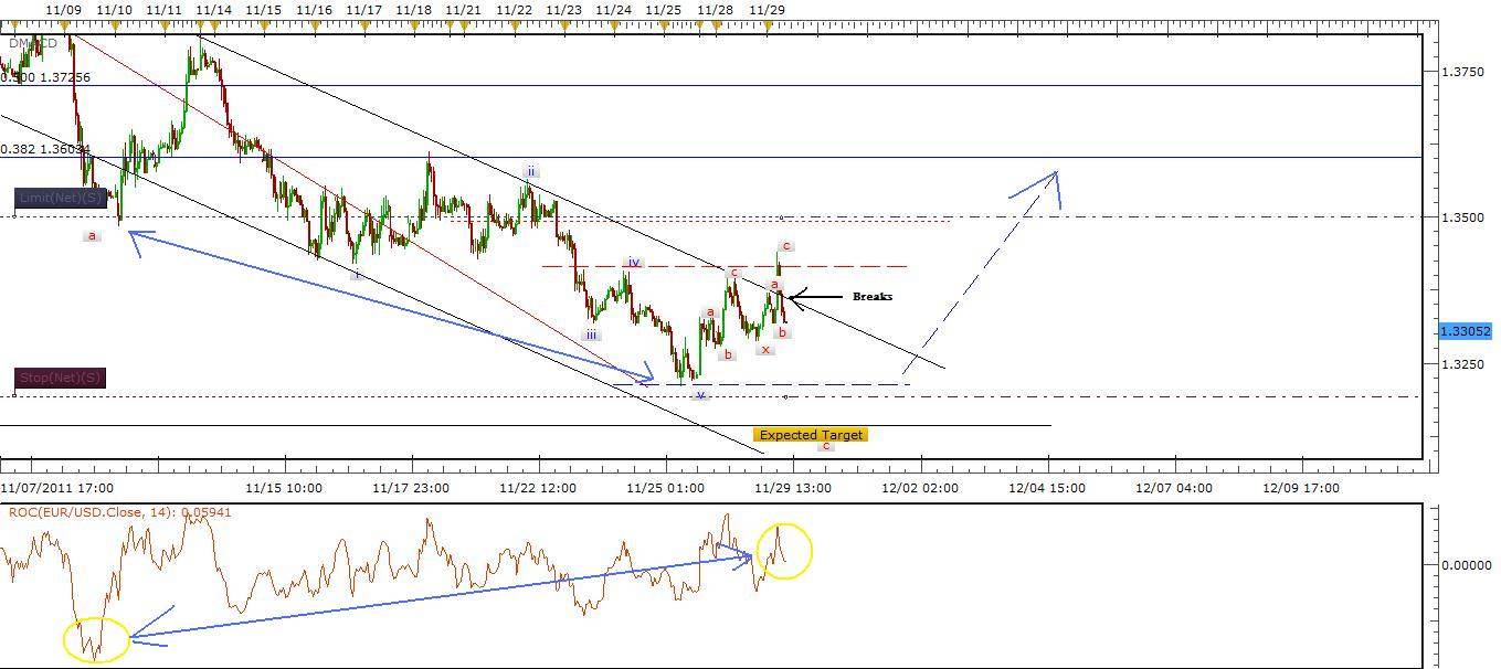 Description: Trend has finally breaks the cloud Kumo hitting the Doji support which indicate a bounce is on the way for a day or two going toward 0.382 fib level as shown on hourly chart. I do expect a major drop once trend breaks 1.32050 heading downward. Again we can all notice how senkou A 26 days crossed Senkou B 52 days for a negative sentiment on weekly chart. I suggest a short strategy that I will send in a day or two or once more economic news flows in order to trade the negative momentum. A quick look at hourly chart, we notice a positive divergence between trend and rate of change. ROC changed from negative to positive once wave v reached 1.618 fib level. Double Zigzag completed upward so far and more complex waves are expected before trend falls.