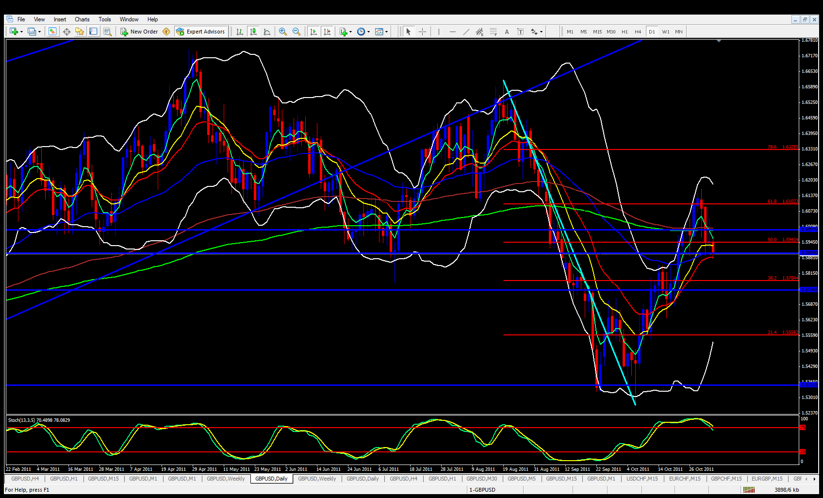 The upper Bollinger band is also pointing down. What I cannot ignore however is that price is sitting spot on the 21 and 55 ema's and on the daily chart these ema's do hold a lot of weight and price is at a fib level to the upside.