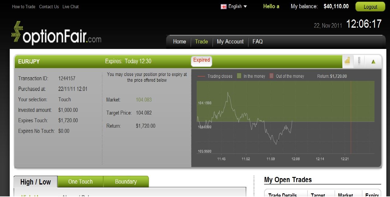 I placed $1,000 on “Touch” at optionFair™ Binary Options Trading Platform with the understanding that touches the strike price prior to expiration, I will have a 72% re-turn, giving me $720 on my initial investment. The difference between the underlying security's current market price and the option's strike price represents the amount of profit per share gained upon the exercise or the sale of the option. This is true for options that are in the money.