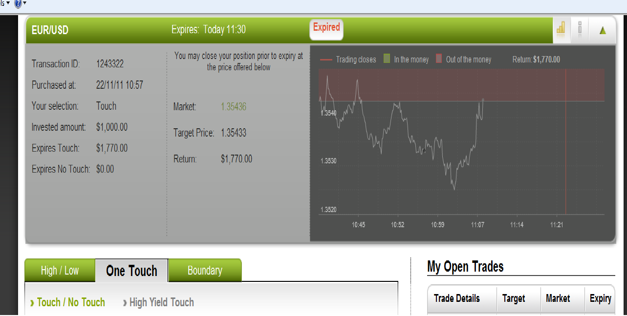 I placed $1,000 on “Touch” at optionFair™ Binary Options Trading Platform, so that if this option touches the strike price prior to expiry, I will receive a 65% return, or $650 on my investment. At the buying time, 10:56, the EUR/USD traded at 1.35332 and the target price was 1.33433.The market hit the strike price before and I won $720.